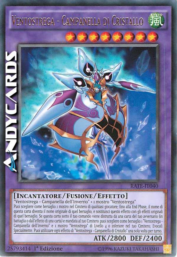 Ventostrega - Campanella dell'Inverno + 1 mostro "Ventostrega" - Puoi scegliere come bersaglio 1 mostro nel Cimitero di qualsiasi giocatore; fino alla End Phase, il nome di questa carta diventa il nome originale di quel bersaglio, e sostituisci questo effetto con gli effetti originali di quel bersaglio. Se questa carta sotto il tuo comando viene distrutta da una carta del tuo avversario (in battaglia o dall'effetto di una carta) e mandata al tuo Cimitero: puoi scegliere come bersaglio 1 "Ventostrega - Campanella dell'Inverno" e 1 mostro "Ventostrega" di Livello 4 o inferiore nel tuo Cimitero; Evocali Specialmente. Puoi utilizzare ogni effetto di "Ventostrega - Campanella di Cristallo" una sola volta per turno.