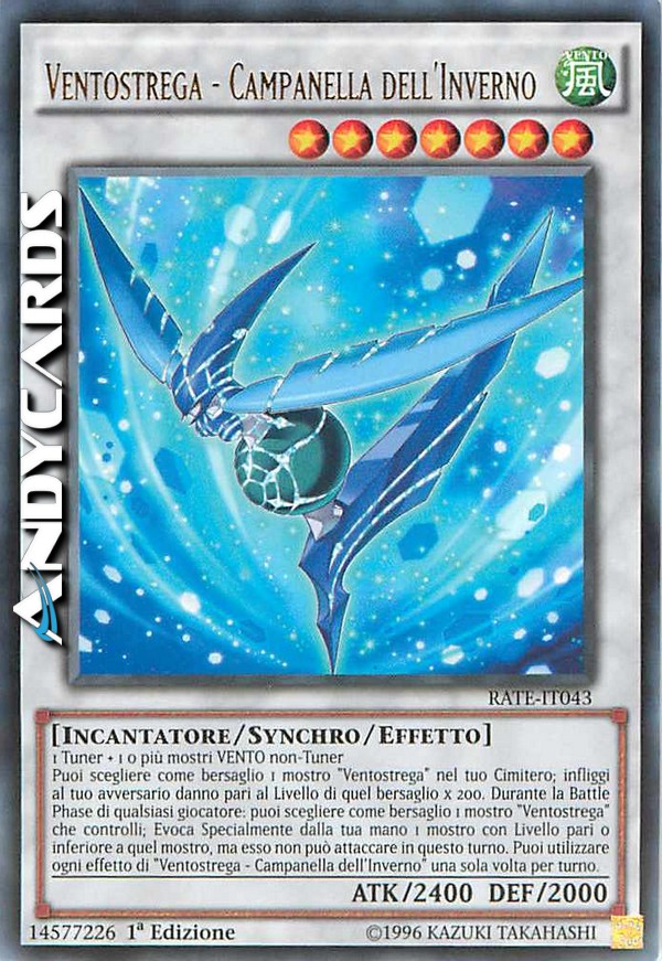 1 Tuner + 1 o più mostri VENTO non-Tuner - Puoi scegliere come bersaglio 1 mostro "Ventostrega" nel tuo Cimitero; infliggi al tuo avversario danno pari al Livello di quel bersaglio x 200. Durante la Battle Phase di qualsiasi giocatore: puoi scegliere come bersaglio 1 mostro "Ventostrega" che controlli; Evoca Specialmente dalla tua mano 1 mostro con Livello pari o inferiore a quel mostro, ma esso non può attaccare in questo turno. Puoi utilizzare ogni effetto di "Ventostrega - Campanella dell'Inverno" una sola volta per turno.