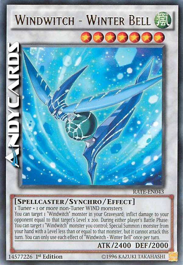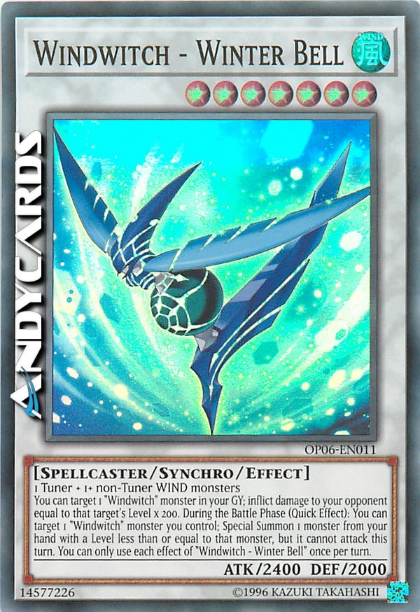 1 Tuner + 1 or more non-Tuner WIND monsters - You can target 1 "Windwitch" monster in your Graveyard; inflict damage to your opponent equal to that target's Level x 200. During either player's Battle Phase: You can target 1 "Windwitch" monster you control; Special Summon 1 monster from your hand with a Level less than or equal to that monster, but it cannot attack this turn. You can only use each effect of "Windwitch - Winter Bell" once per turn.
