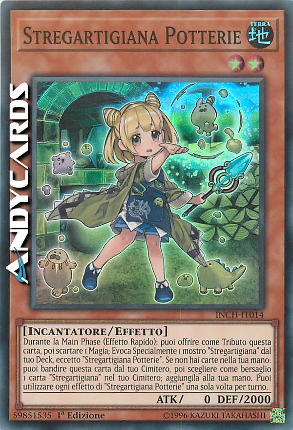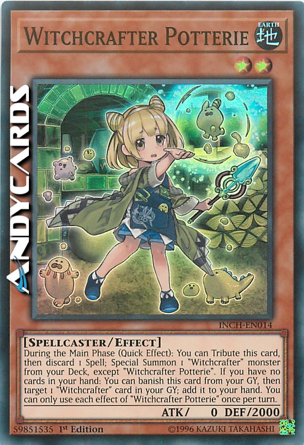During the Main Phase (Quick Effect): You can Tribute this card, then discard 1 Spell; Special Summon 1 "Witchcrafter" monster from your Deck, except "Witchcrafter Potterie". If you have no cards in your hand: You can banish this card from your GY, then target 1 "Witchcrafter" card in your GY; add it to your hand. You can only use each effect of "Witchcrafter Potterie" once per turn.