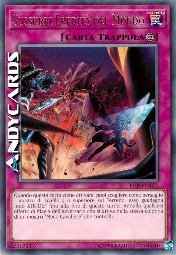 Quando questa carta viene attivata: puoi scegliere come bersaglio 1 mostro di Livello 5 o superiore sul Terreno; esso guadagna 1000 ATK/DEF fino alla fine di questo turno. Annulla qualsiasi effetto di Magia dell'avversario che si attiva nella stessa colonna di un mostro "Meck-Cavaliere" che controlli.