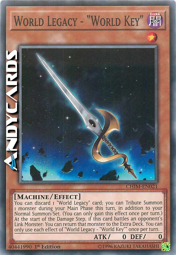 Puoi scartare 1 carta "Eredità del Mondo"; puoi Evocare tramite Tributo 1 mostro durante la tua Main Phase in questo turno, in aggiunta alla tua Evocazione Normale/Posizionamento. (Puoi guadagnare questo effetto una sola volta per turno.) All'inizio del Damage Step, se questa carta combatte con un Mostro Link dell'avversario: puoi far ritornare quel mostro nell'Extra Deck. Puoi utilizzare ogni effetto di "Eredità del Mondo - "Chiave del Mondo"" una sola volta per turno.