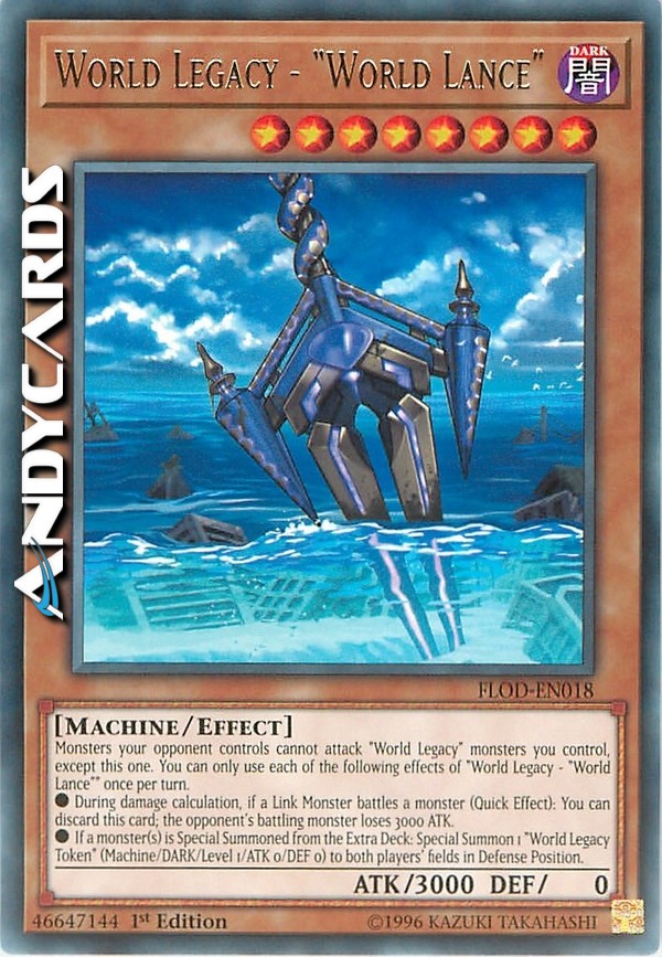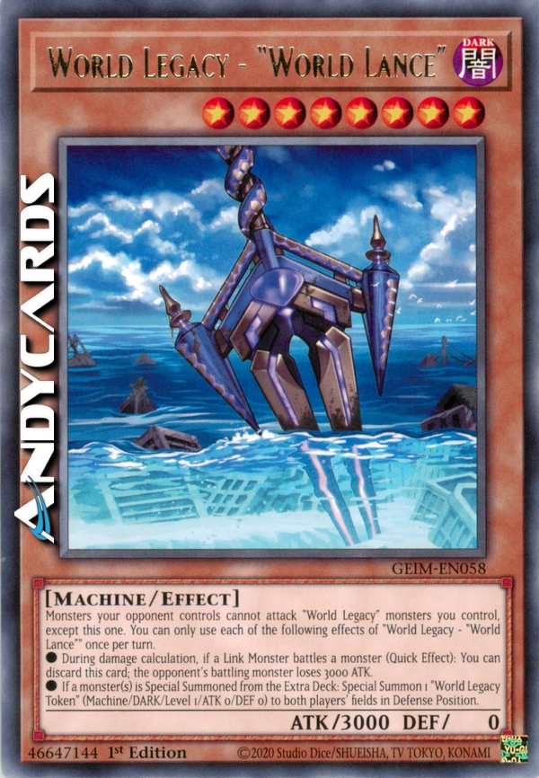 Monsters your opponent controls cannot attack "World Legacy" monsters you control, except this one. You can only use each of the following effects of "World Legacy - "World Lance"" once per turn.