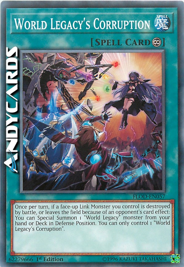 Una volta per turno, se un Mostro Link scoperto che controlli viene distrutto in battaglia, o lascia il Terreno a causa dell'effetto di una carta dell'avversario: puoi Evocare Specialmente 1 mostro "Eredità del Mondo" dalla tua mano o Deck in Posizione di Difesa. Puoi controllare solo 1 "Corruzione dell'Eredità del Mondo".