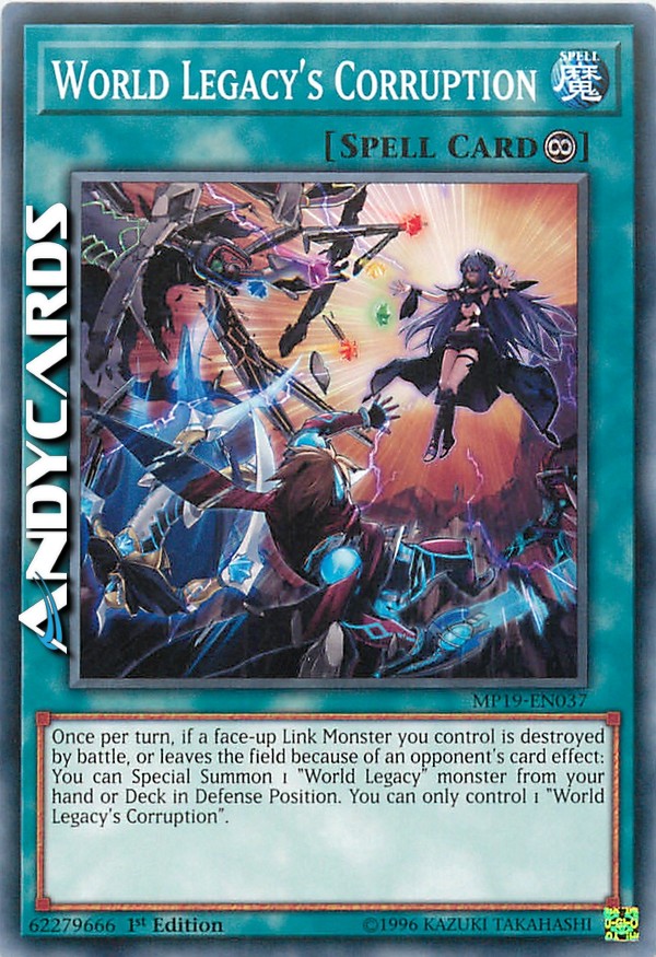 Once per turn, if a face-up Link Monster you control is destroyed by battle, or leaves the field because of an opponent's card effect: You can Special Summon 1 "World Legacy" monster from your hand or Deck in Defense Position. You can only control 1 "World Legacy's Corruption".