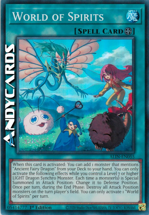 When this card is activated: You can add 1 monster that mentions "Ancient Fairy Dragon" from your Deck to your hand. You can only activate the following effects while you control a Level 7 or higher LIGHT Dragon Synchro Monster. Each time a monster(s) is Special Summoned in Attack Position: Change it to Defense Position. Once per turn, during the End Phase: Destroy all Attack Position monsters on the turn player's field. You can only activate 1 "World of Spirits" per turn.