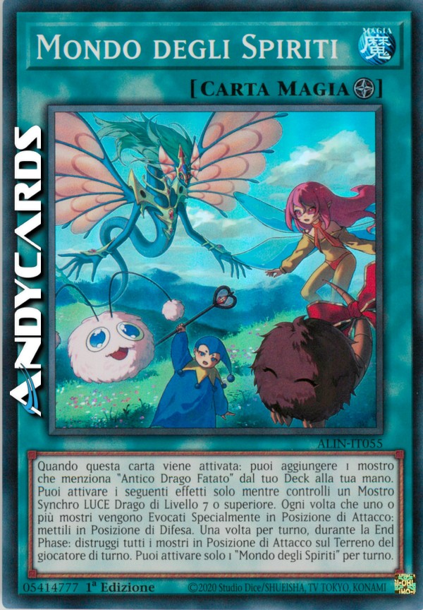 Quando questa carta viene attivata: puoi aggiungere 1 mostro che menziona "Antico Drago Fatato" dal tuo Deck alla tua mano. Puoi attivare i seguenti effetti solo mentre controlli un Mostro Synchro LUCE Drago di Livello 7 o superiore. Ogni volta che uno o più mostri vengono Evocati Specialmente in Posizione di Attacco: mettili in Posizione di Difesa. Una volta per turno, durante la End Phase: distruggi tutti i mostri in Posizione di Attacco sul Terreno del giocatore di turno. Puoi attivare solo 1 "Mondo degli Spiriti" per turno.