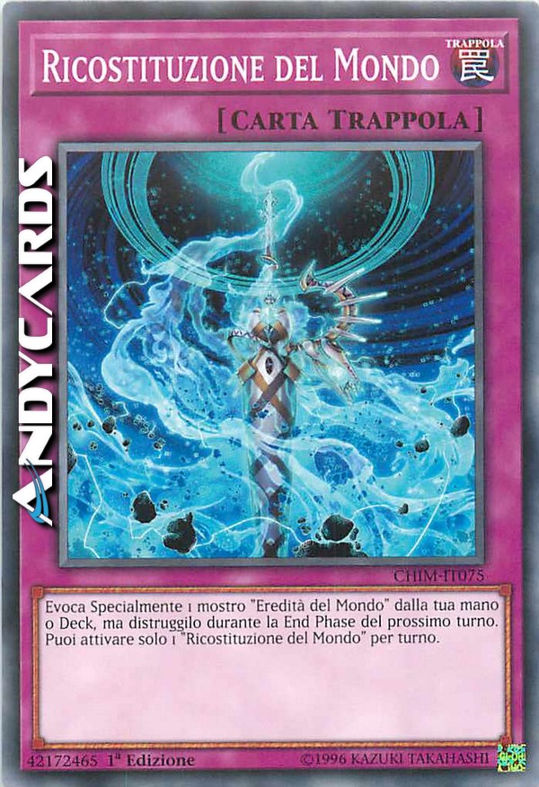 Evoca Specialmente 1 mostro "Eredità del Mondo" dalla tua mano o Deck, ma distruggilo durante la End Phase del prossimo turno. Puoi attivare solo 1 "Ricostituzione del Mondo" per turno.