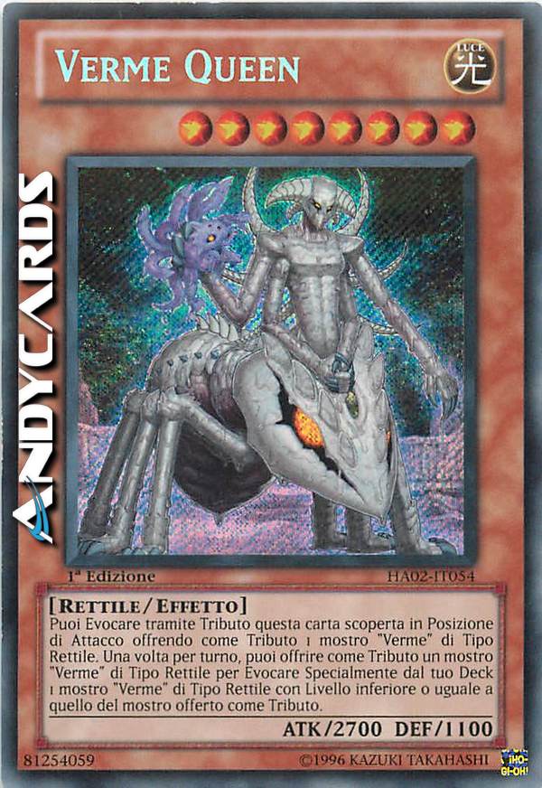 Puoi evocare tramite tributo questa carta scoperta in posizioe di attacco offrendo come tributo 1 mostro"verme"di tipo rettile.Una volta per turno,puoi offrire come tributo un mostro "verme"di tipo rettile per evocare specialmente dal tuo deck 1 mostro "verme"di tipo rettile con livello inferiore o uguale a quello del mostro offerto come tributo.