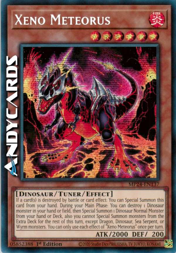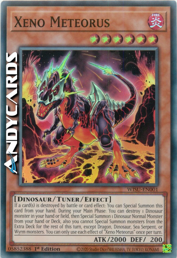 Se una o più carte vengono distrutte in battaglia o dall'effetto di una carta: puoi Evocare Specialmente questa carta dalla tua mano. Durante la tua Main Phase: puoi distruggere 1 mostro Dinosauro nella tua mano o Terreno, poi Evocare Specialmente 1 Mostro Normale Dinosauro dalla tua mano o Deck, inoltre non puoi Evocare Specialmente mostri dall'Extra Deck per il resto di questo turno, eccetto mostri Drago, Dinosauro, Serpente Marino o Wyrm. Puoi utilizzare ogni effetto di "Xeno Meteorsauro" una sola volta per turno.