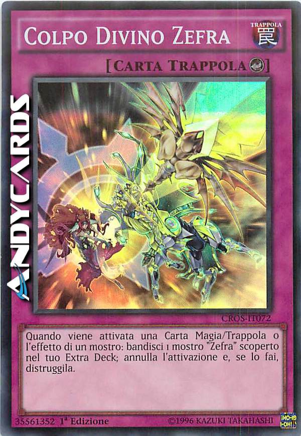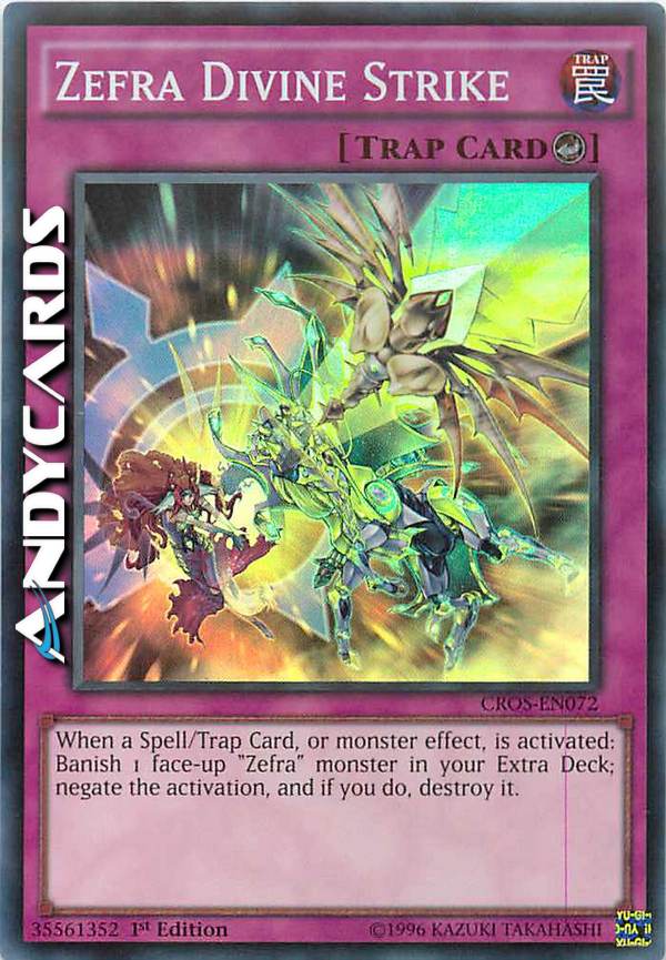 Quando viene attivata una Carta Magia/Trappola o l'effetto di un mostro: bandisci 1 mostro "Zefra" scoperto nel tuo Extra Deck; annulla l'attivazione e, se lo fai, distruggila.