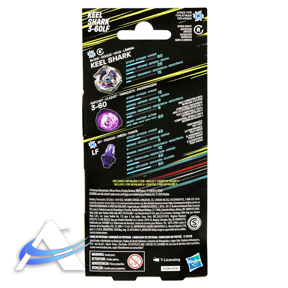 Vivi l'emozione della nuova generazione di stadi, lanciatori e trottole da battaglia Beyblade: Beyblade X con il Beyblade X Keel Shark 3-60LF Booster Pack Set che include 1 trottola Attack Type con rotazione a destra (sono necessari Beystadium e lanciatore, venduti separatamente).