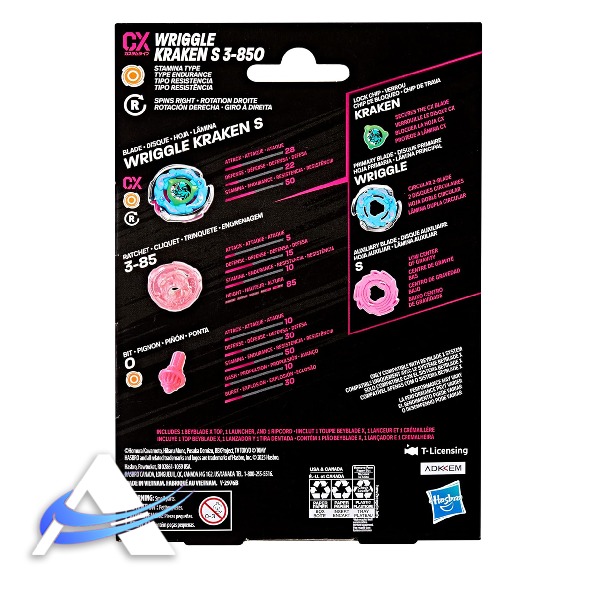 WRIGGLE KRAKEN S 3-85O CX RIGHT-SPIN STAMINA TYPE TYPE CON LAMA DI TIPO STAMINA: include il lanciatore Beyblade X progettato da Takara Tomy e la parte superiore con autentiche parti in metallo pressofuso. La lama primaria di Wriggle Kraken ha forma doppia circolare mentre la Lama Ausiliaria ha un basso centro di gravità