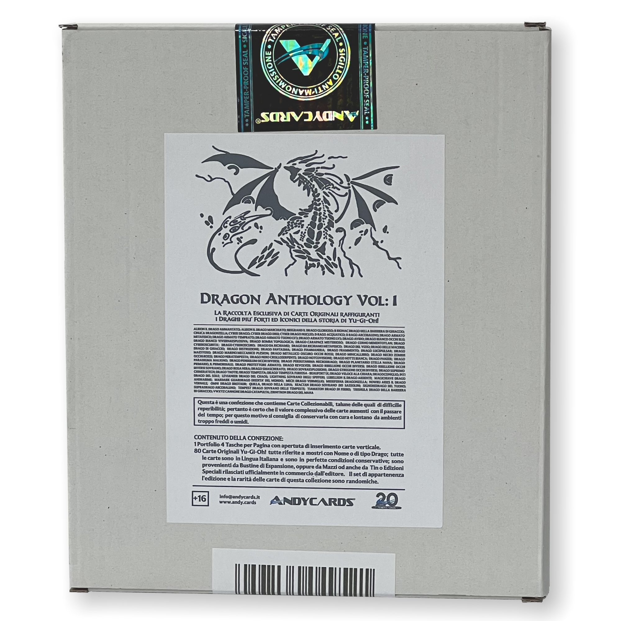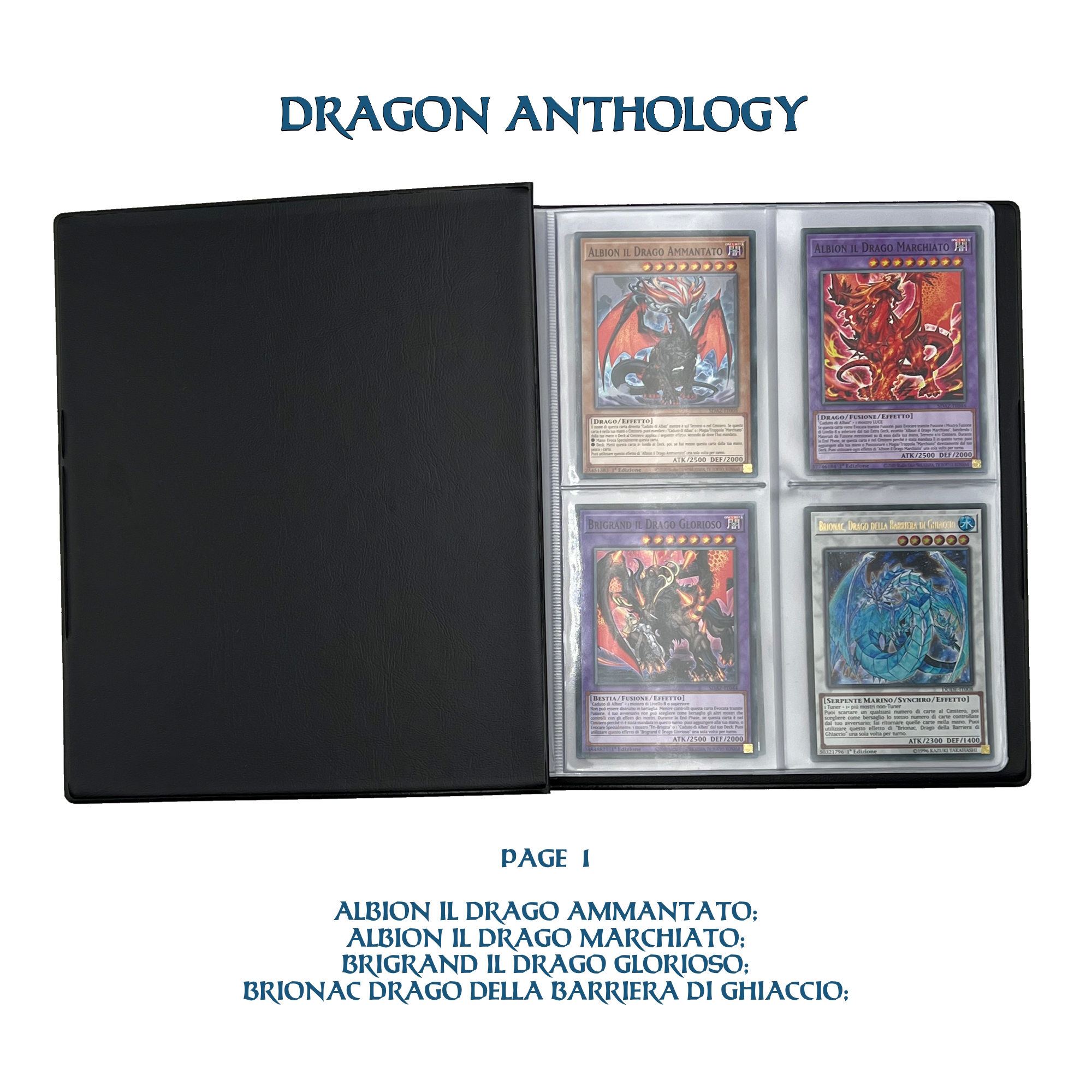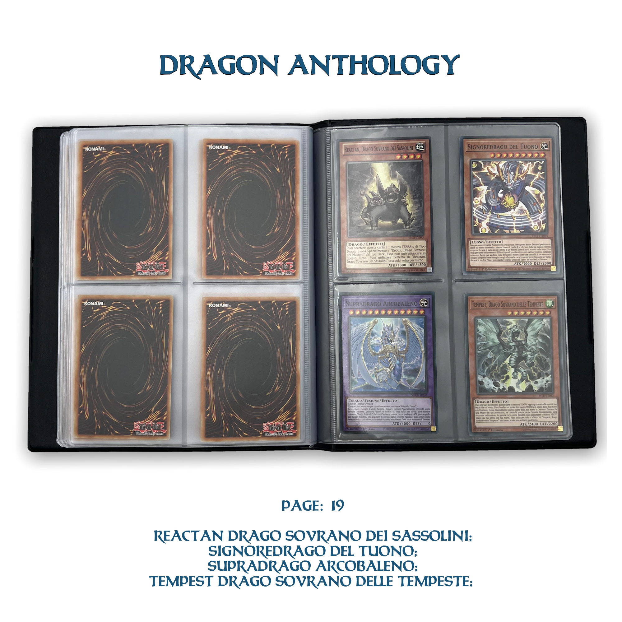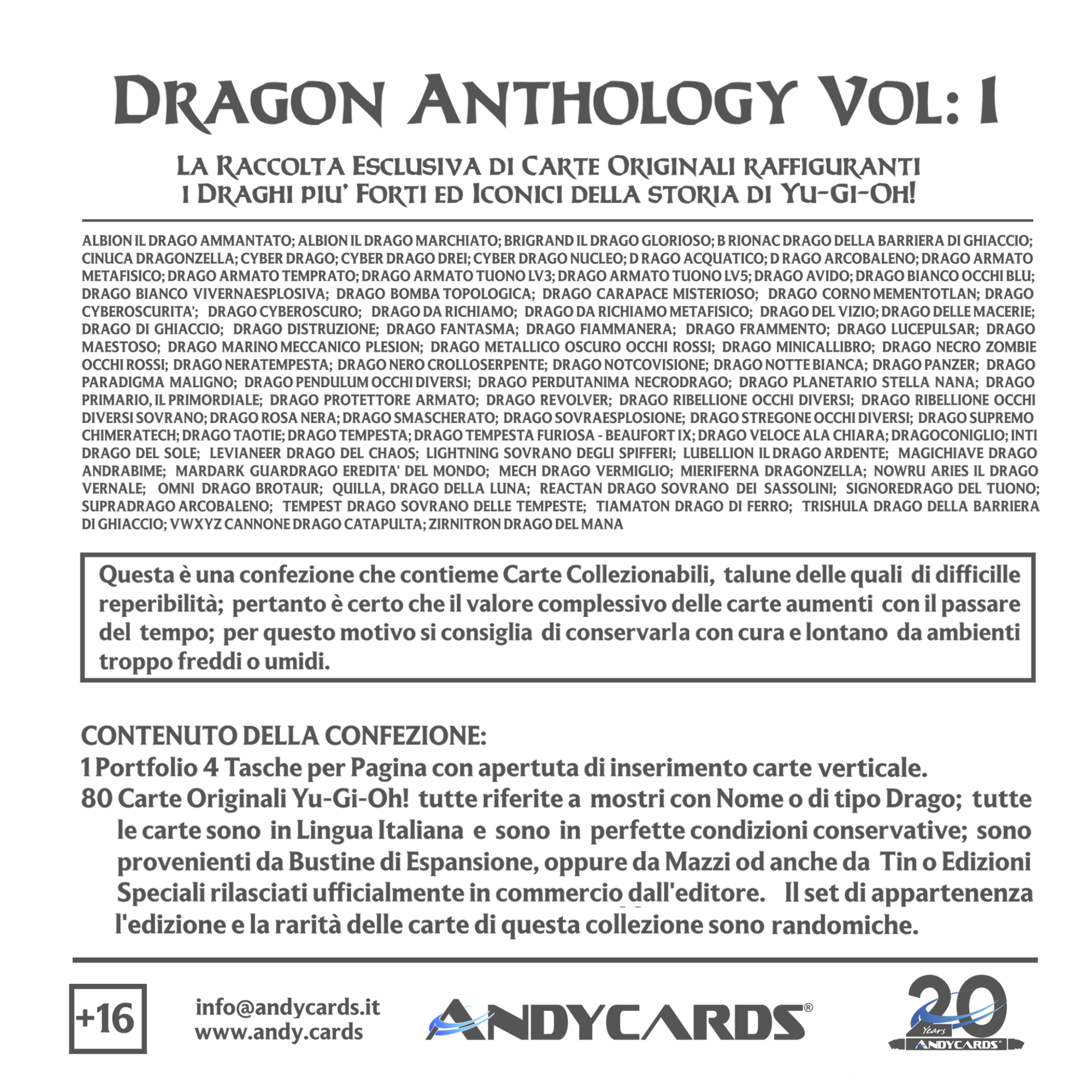 La confezione è composta da un Portfolio esclusivo con 4 tasche per pagina ad inserimento carte verticale, che contiene 80 Carte Originali del Gioco di Carte YU-Gi-Oh! raffiguranti gli 80 Draghi più Forti e più Iconici conosciuti.