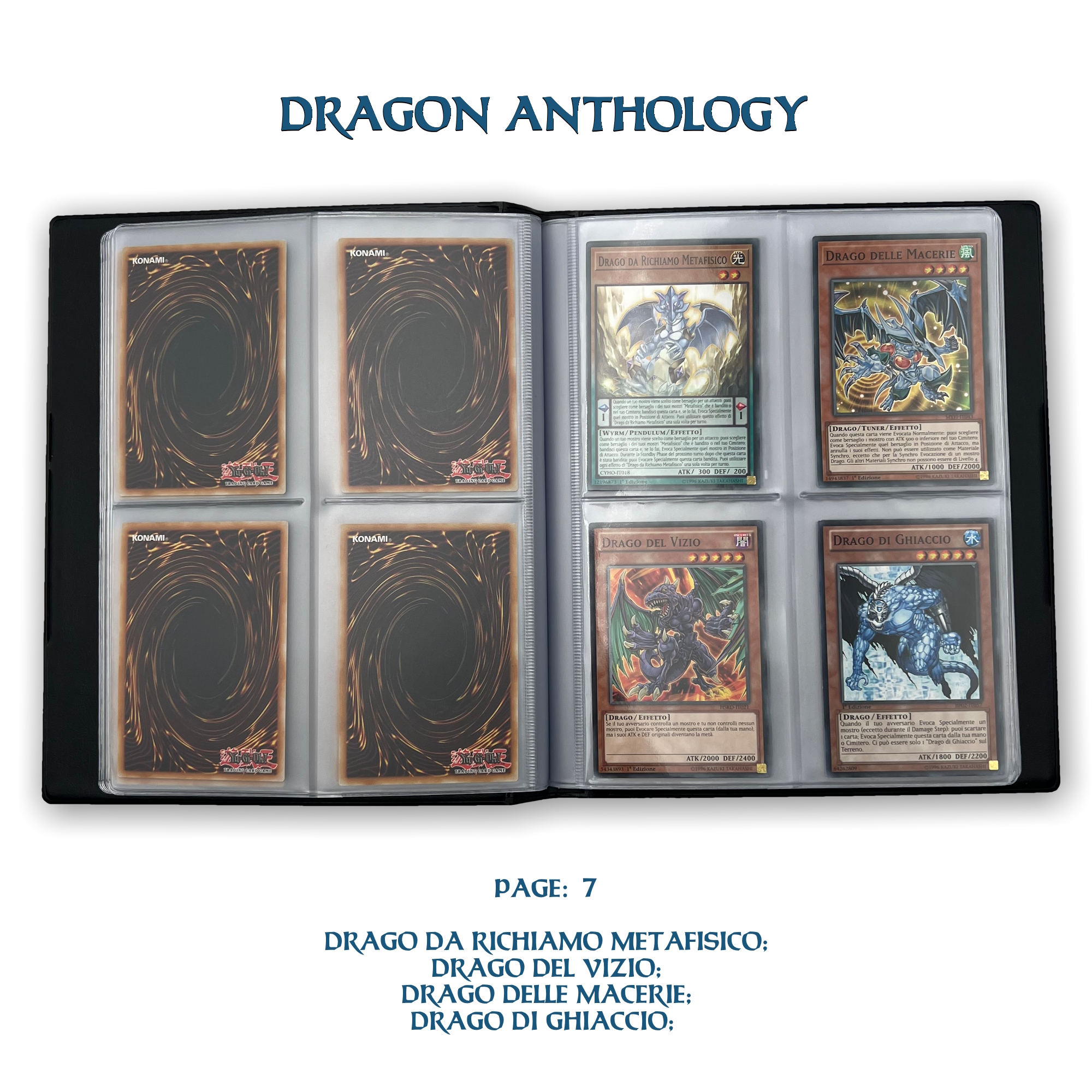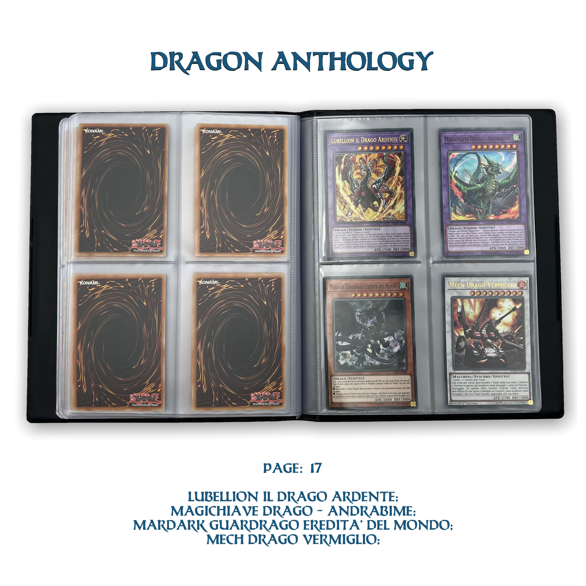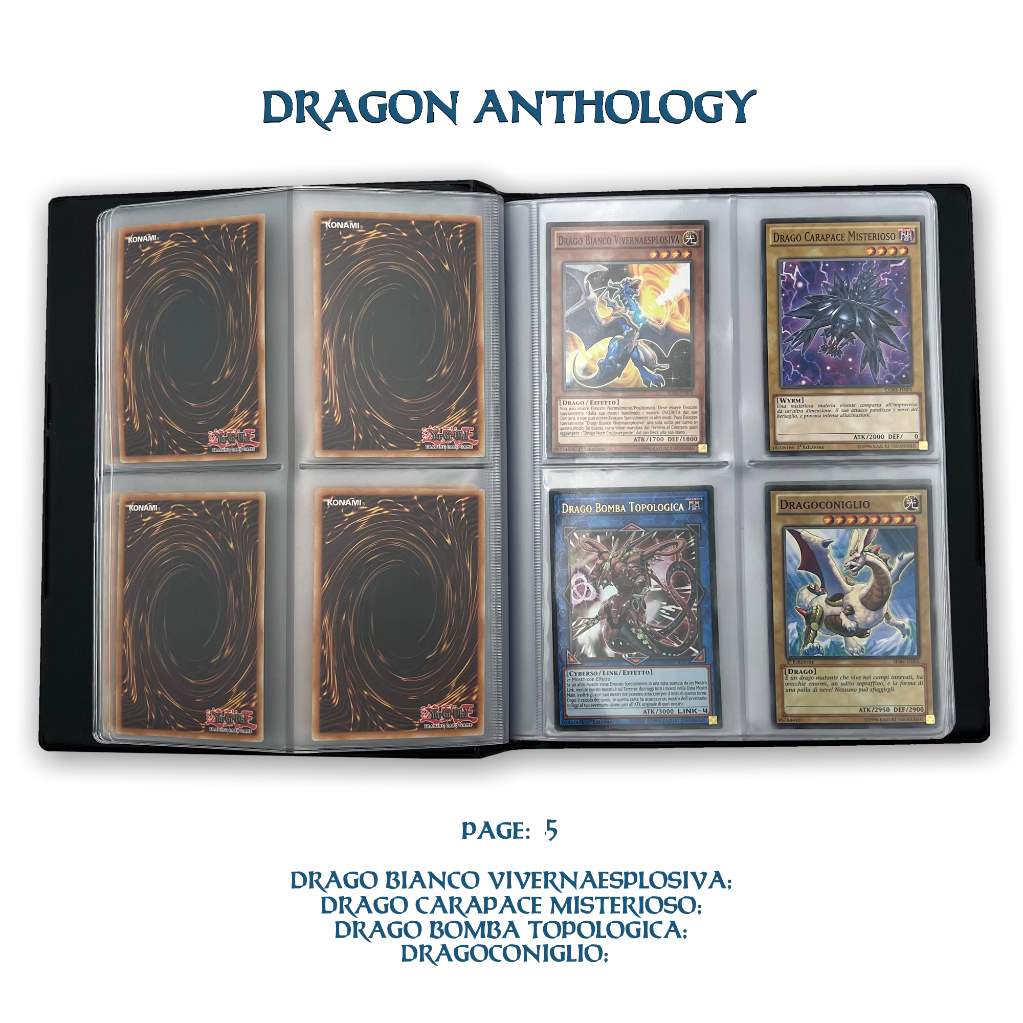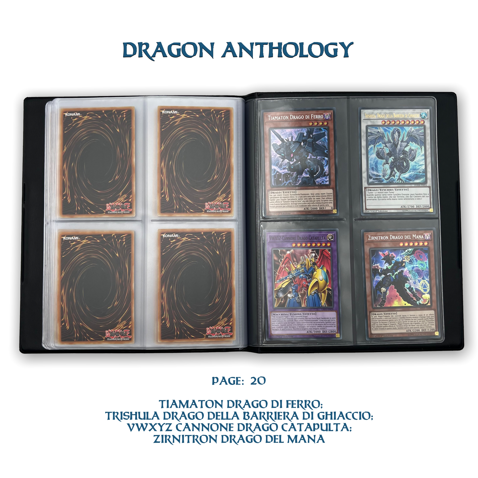 La confezione è composta da un Portfolio esclusivo con 4 tasche per pagina ad inserimento carte verticale, che contiene 80 Carte Originali del Gioco di Carte YU-Gi-Oh! raffiguranti gli 80 Draghi più Forti e più Iconici conosciuti.