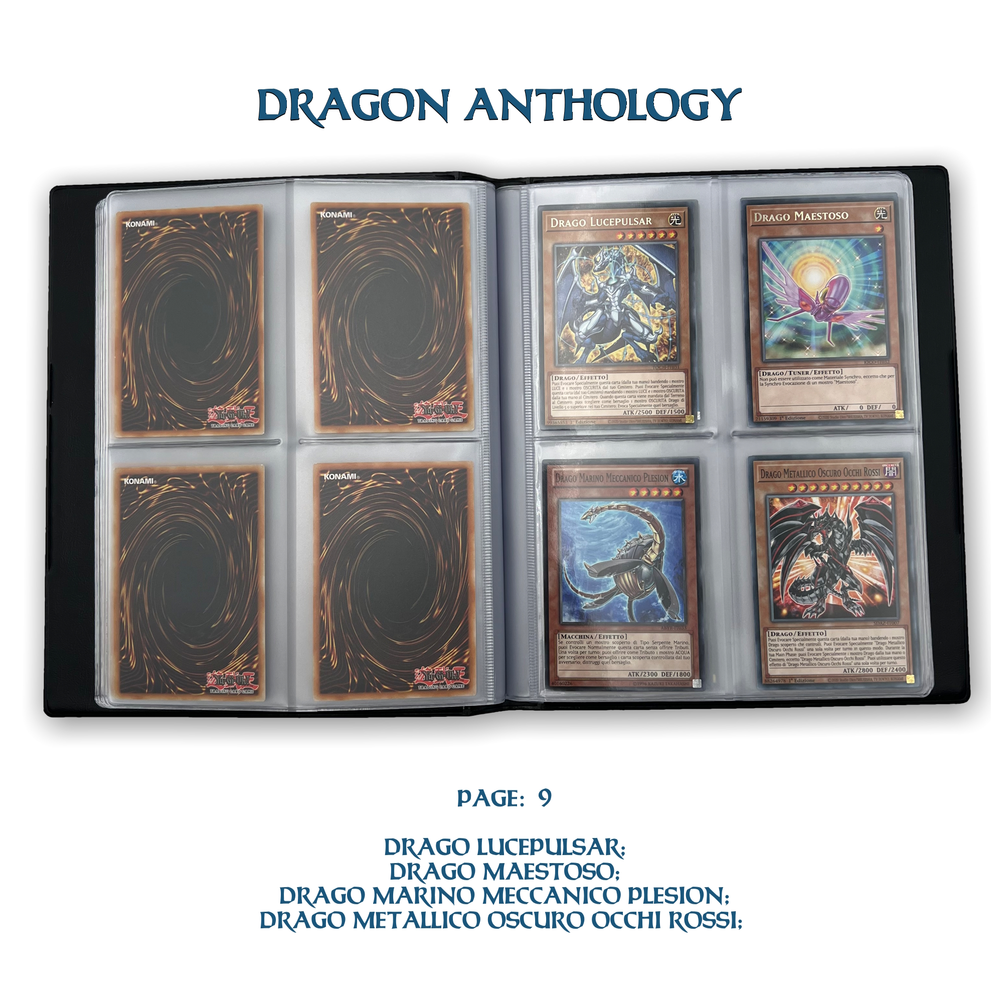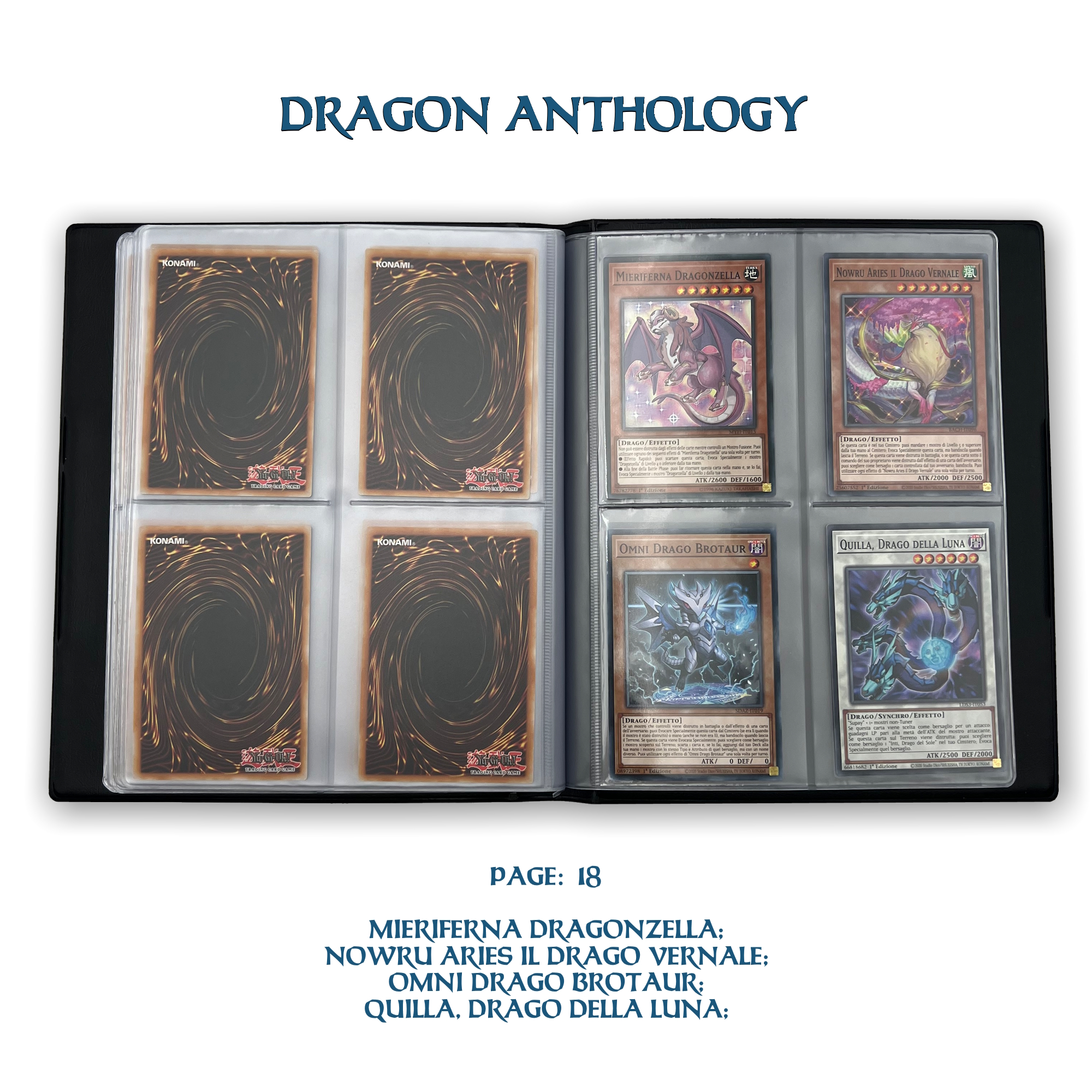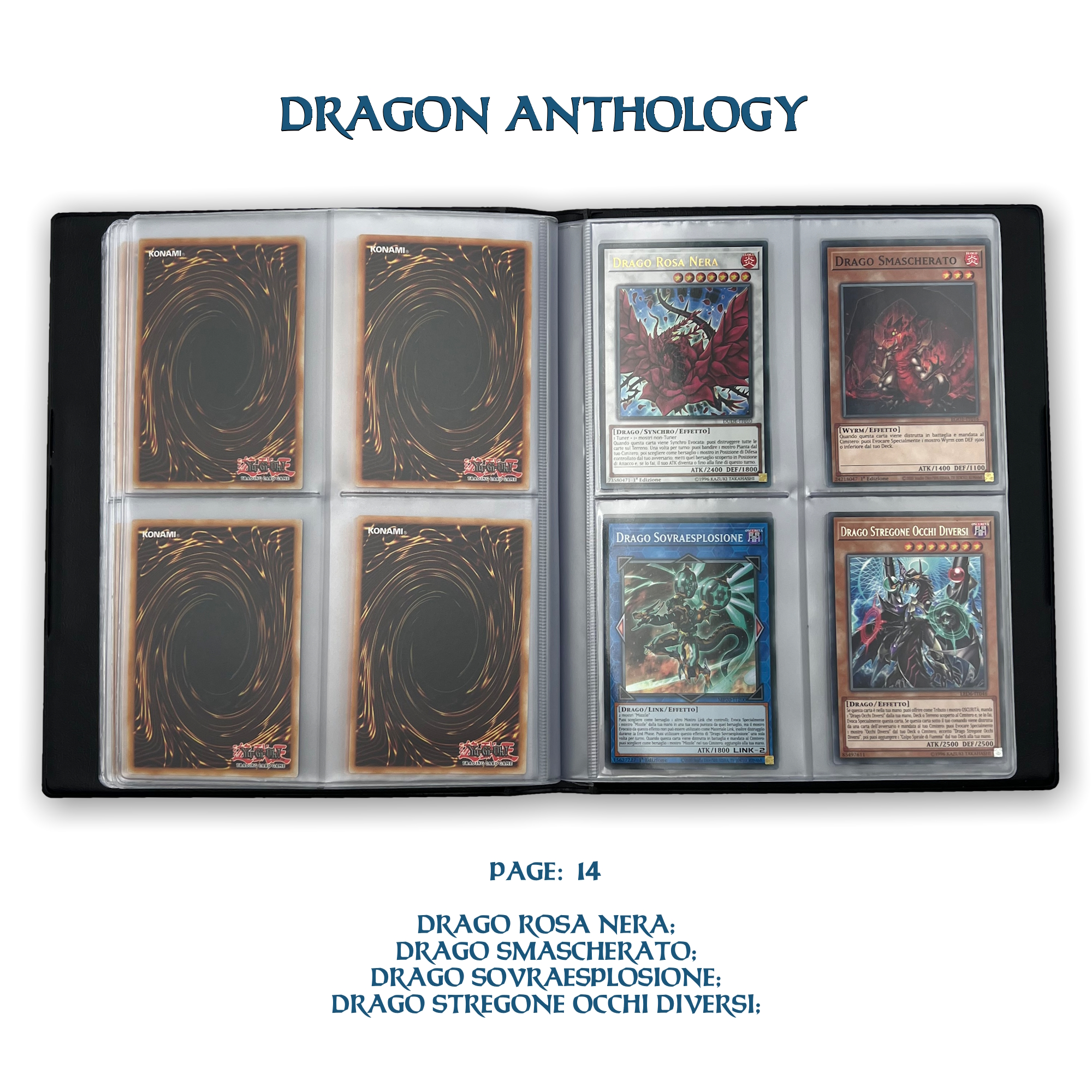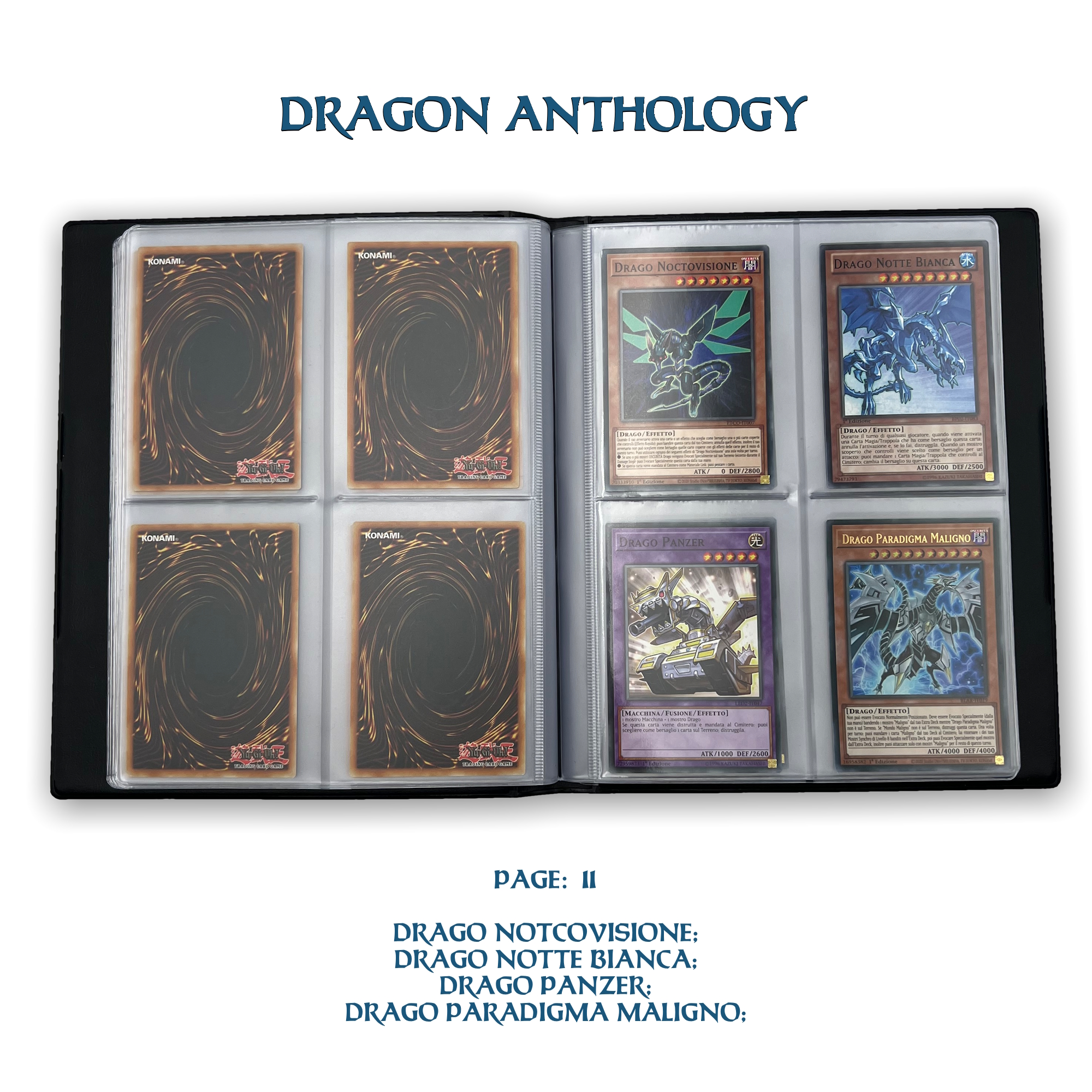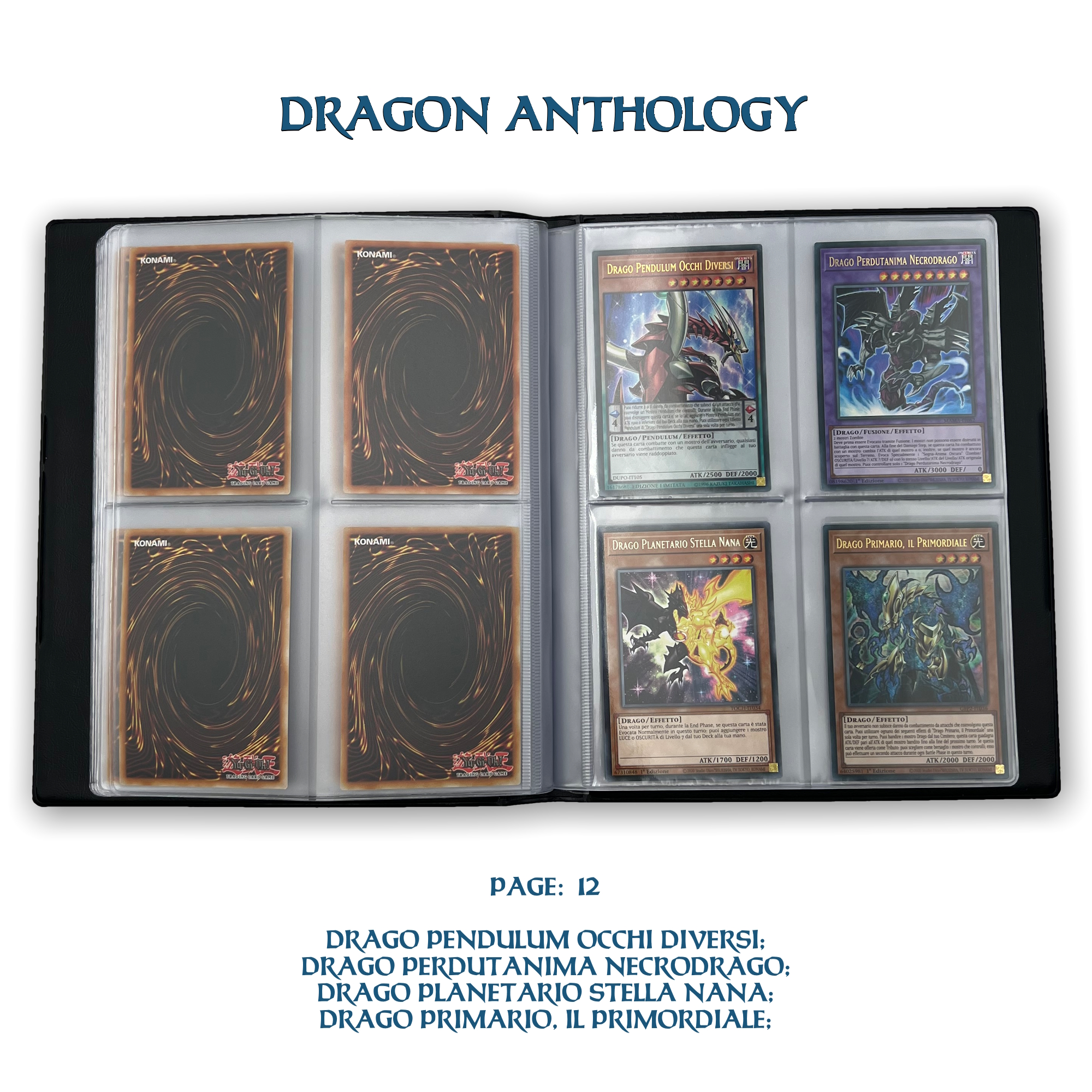 La confezione è composta da un Portfolio esclusivo con 4 tasche per pagina ad inserimento carte verticale, che contiene 80 Carte Originali del Gioco di Carte YU-Gi-Oh! raffiguranti gli 80 Draghi più Forti e più Iconici conosciuti.