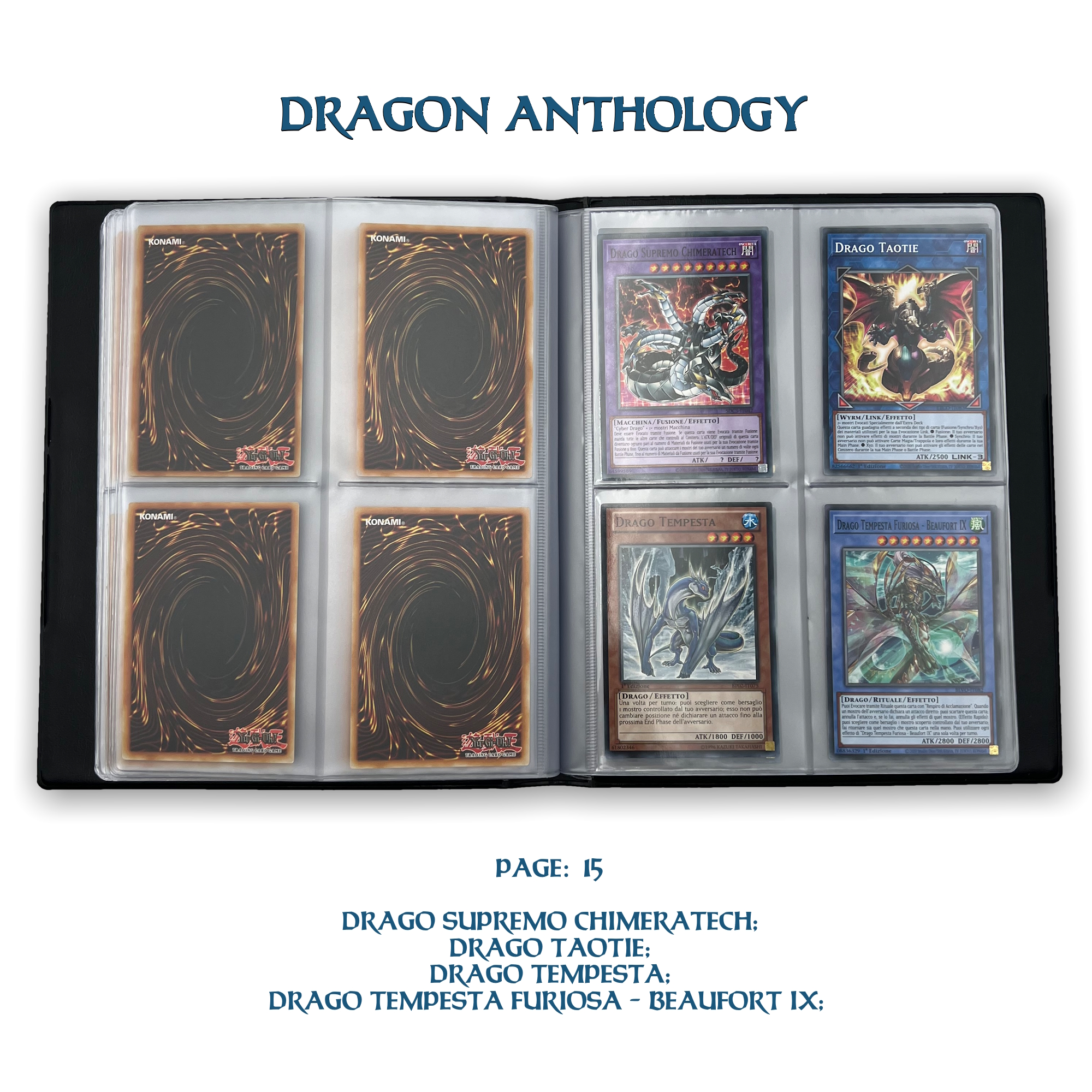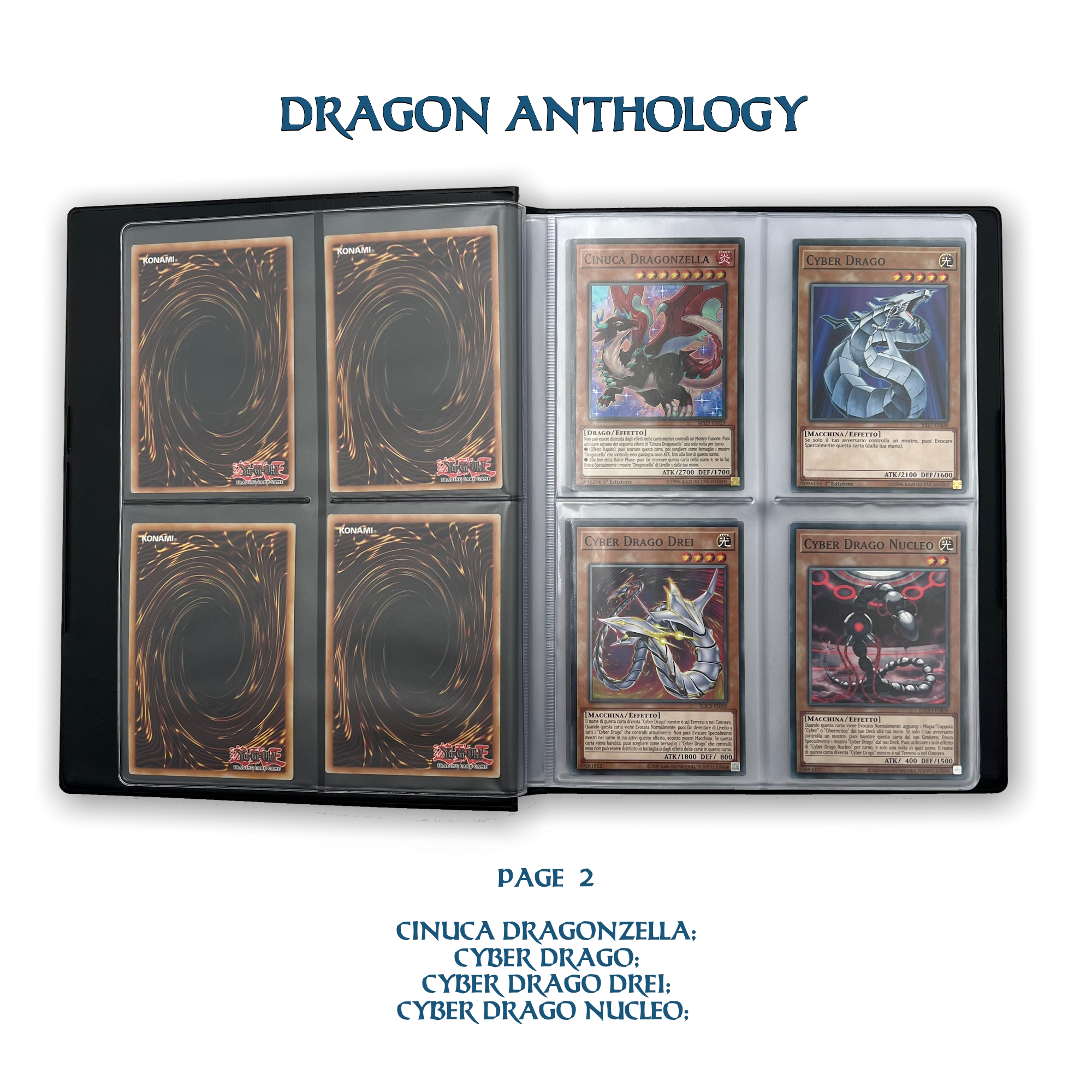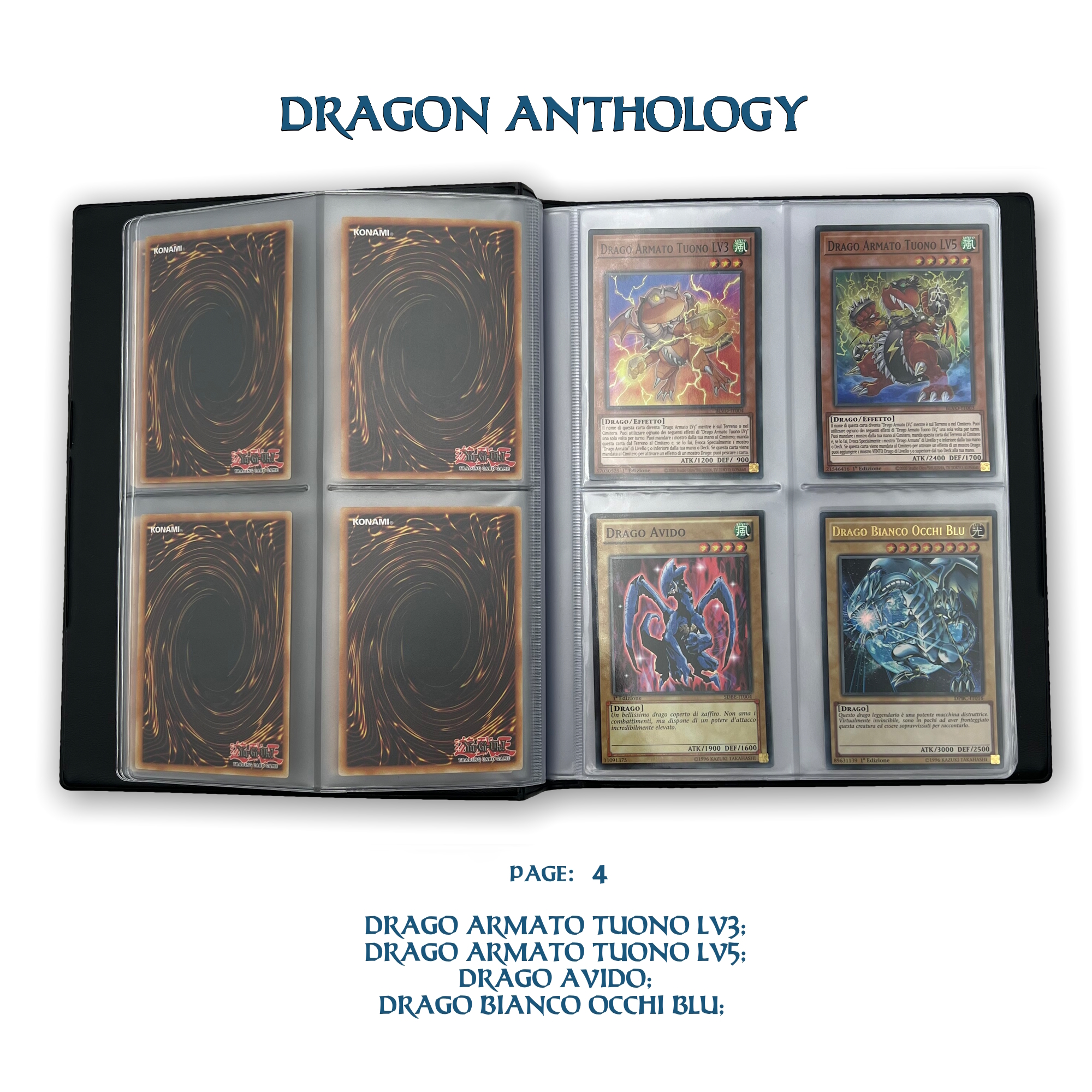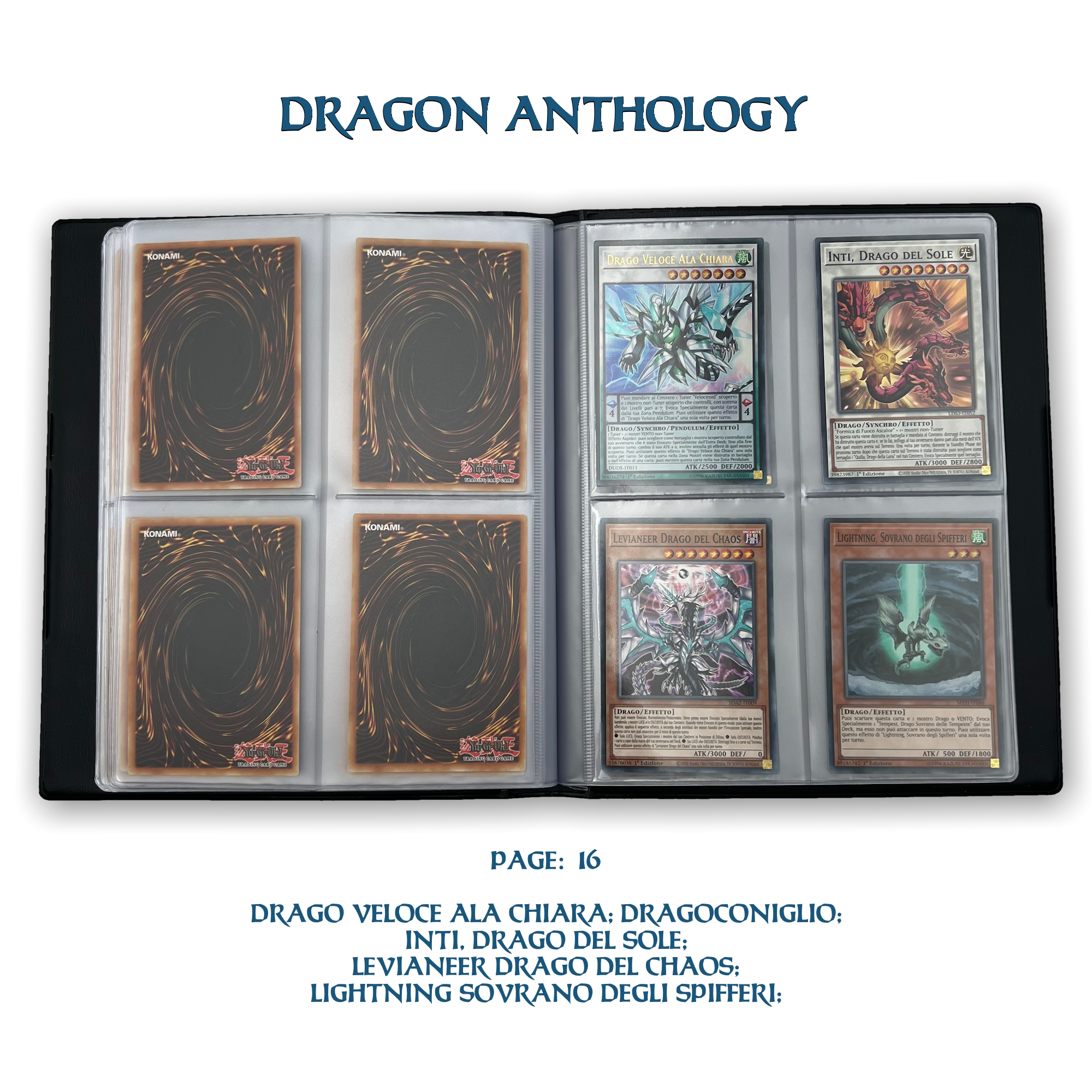 La confezione è composta da un Portfolio esclusivo con 4 tasche per pagina ad inserimento carte verticale, che contiene 80 Carte Originali del Gioco di Carte YU-Gi-Oh! raffiguranti gli 80 Draghi più Forti e più Iconici conosciuti.