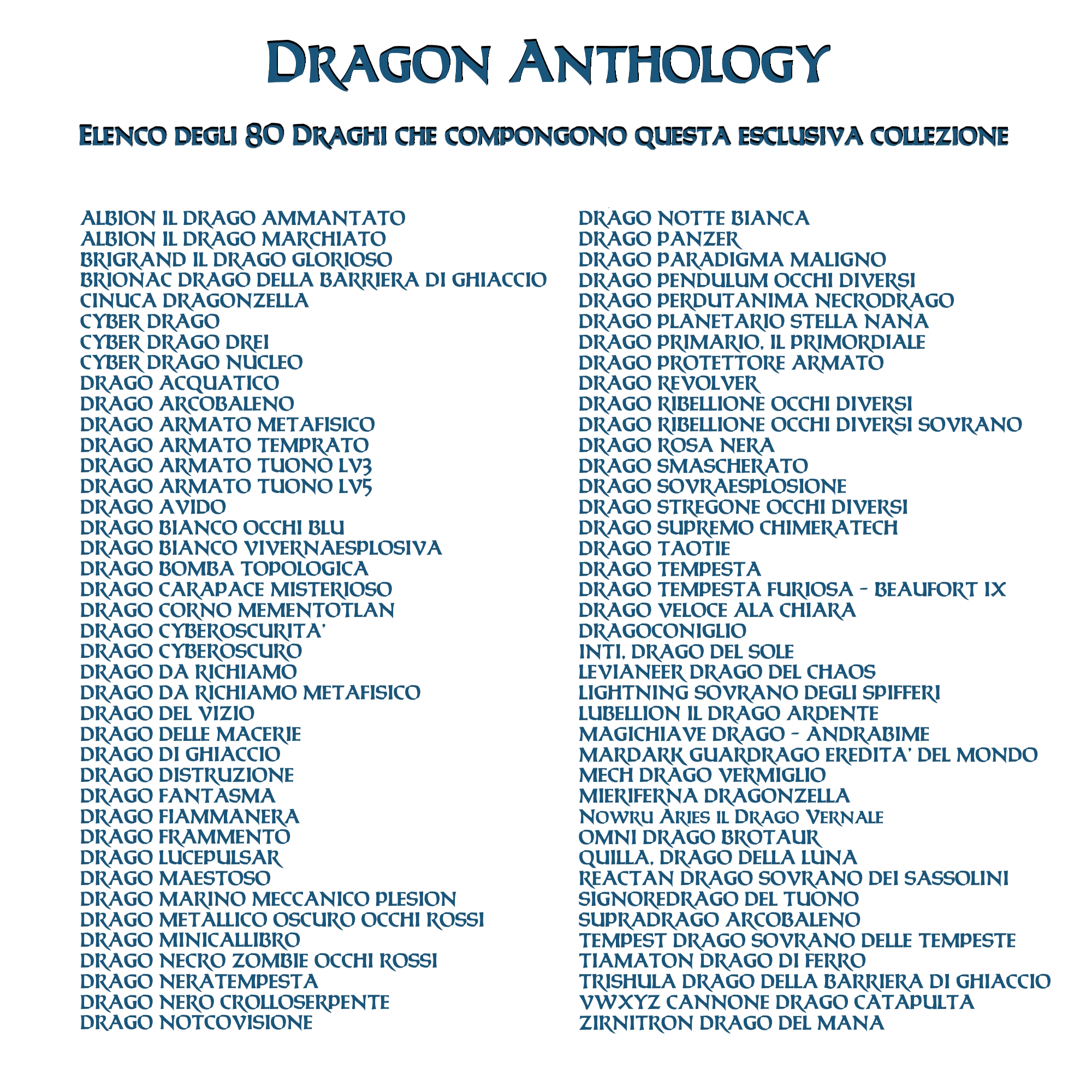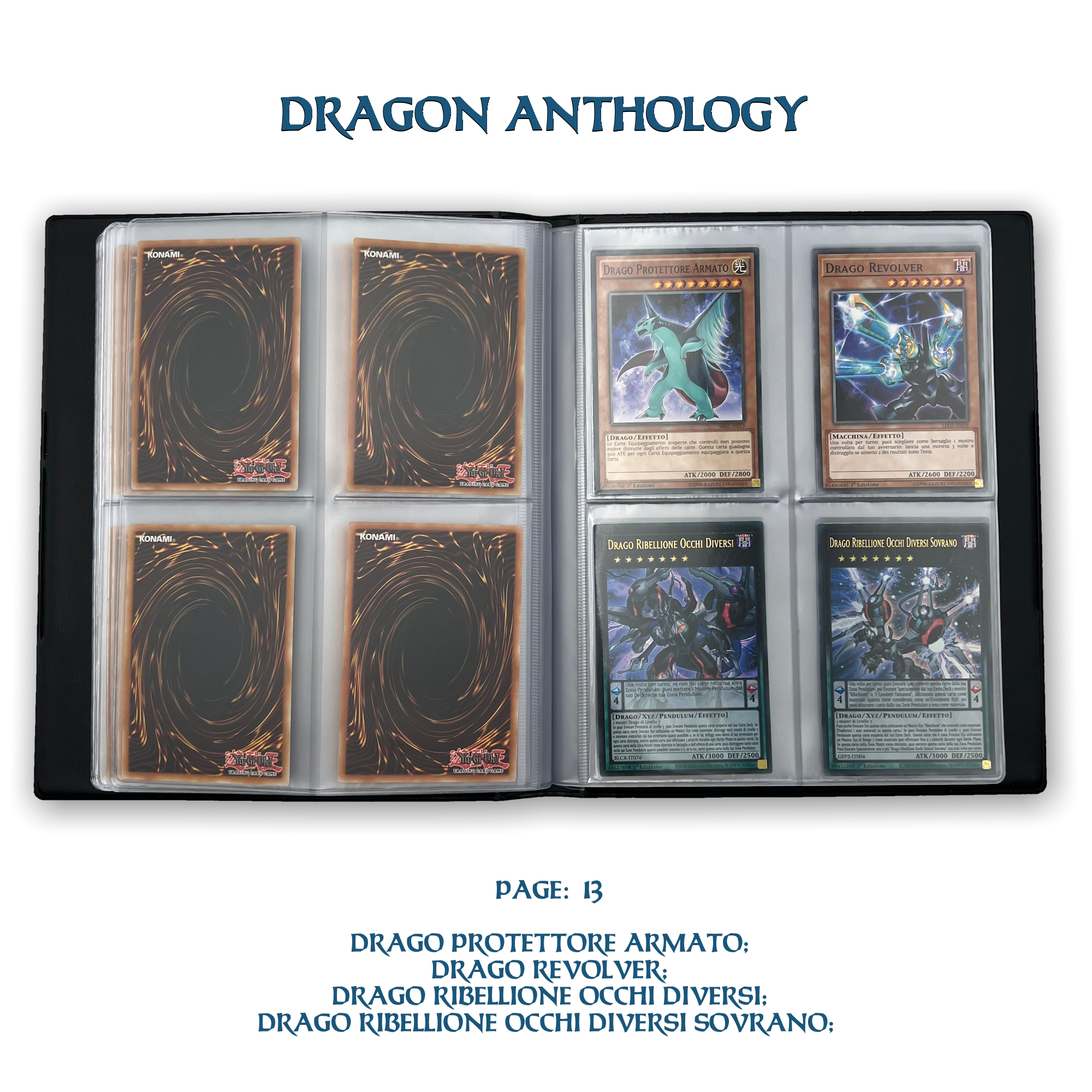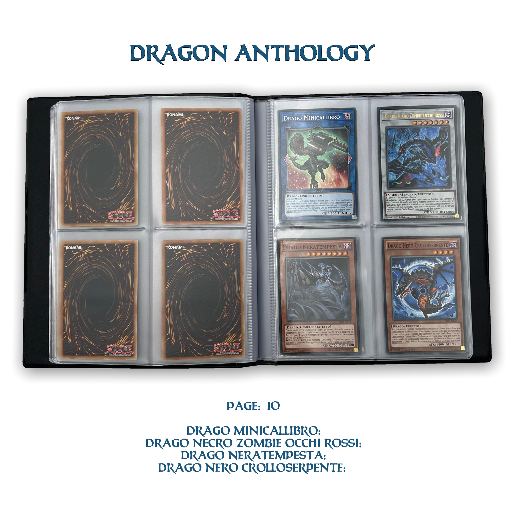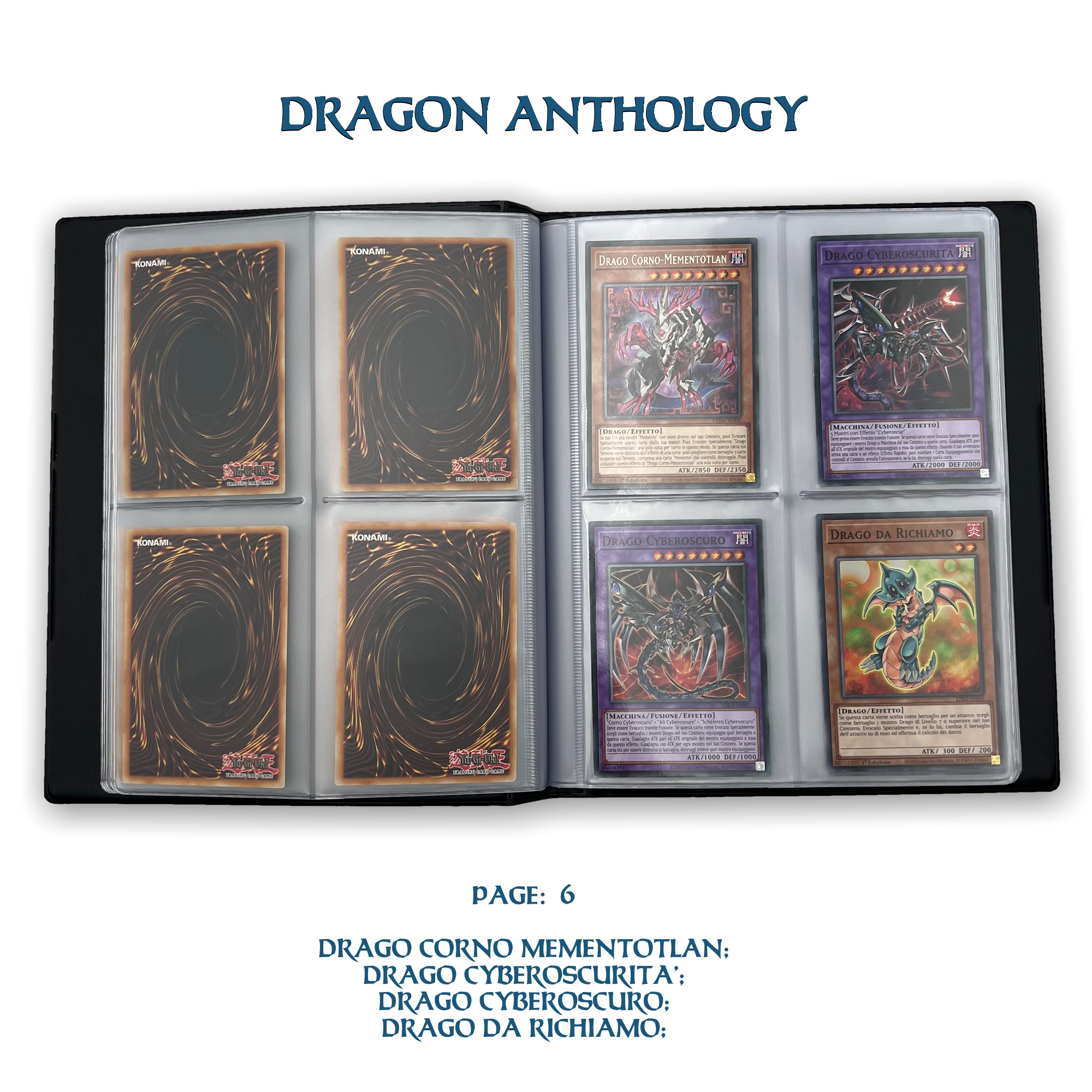 La confezione è composta da un Portfolio esclusivo con 4 tasche per pagina ad inserimento carte verticale, che contiene 80 Carte Originali del Gioco di Carte YU-Gi-Oh! raffiguranti gli 80 Draghi più Forti e più Iconici conosciuti.
