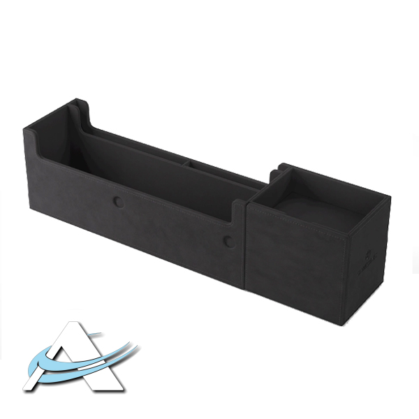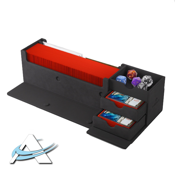 Questa scatola multifunzionale è progettata per contenere perfettamente 400 carte con busta doppia o 540 carte con busta singola. Due cassetti rimovibili con ingegnose alette magnetiche forniscono un facile accesso a gettoni, carte con buste o mazzi interi. Lo scomparto superiore può essere utilizzato per riporre carte giocate, accessori o come mini vassoio per dadi.