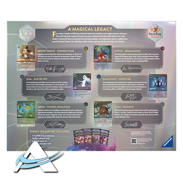 Per un secolo, gli animatori dei Walt Disney Animation Studios hanno utilizzato l'inchiostro per creare personaggi e storie magiche. Il loro lavoro ha ispirato la creazione di Disney Lorcana ed è celebrato in questo set da collezione Disney 100, che include 6 splendide carte con illustrazioni olografiche alternative di Disney Lorcana: The First Chapter TCG e Disney Lorcana: Rise of the Floodborn TCG, illustrate da animatori Disney. Queste carte con illustrazioni alternative sono disponibili solo come parte di questo set da collezione limitato, che include anche 4 buste di espansione di Disney Lorcana: Rise of the Floodborn.
