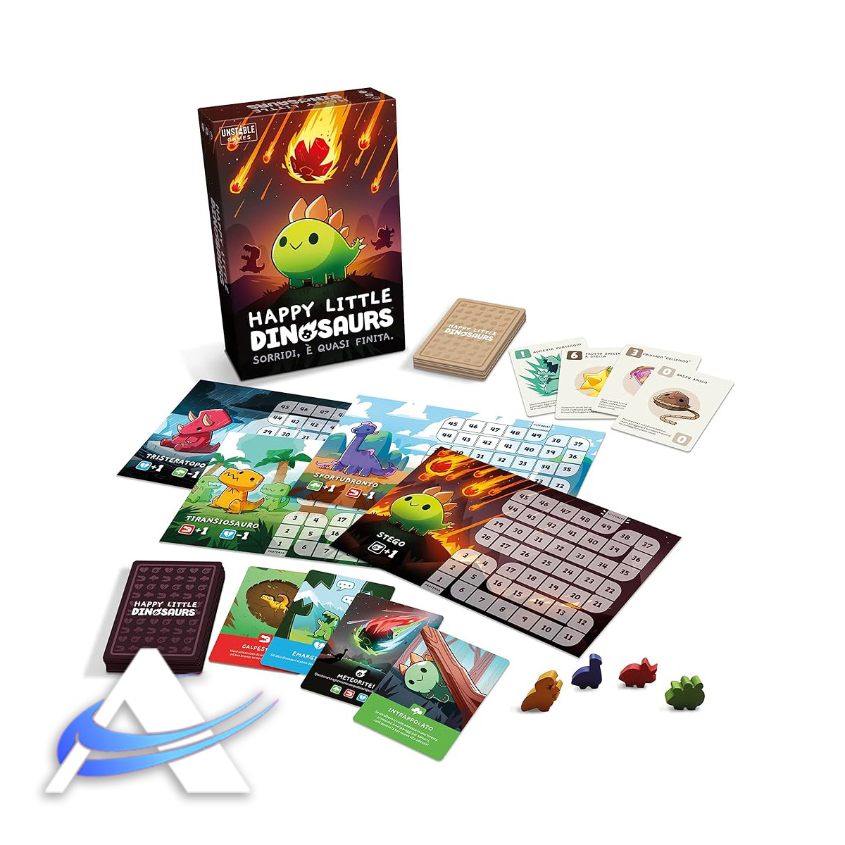 Vi capita mai di sentirvi come dinosauri che cercano di evitare meteoriti cadenti? In questo gioco da 2 a 4 giocatori, dovrete cercare di schivare tutti i disastri Naturali, Predatori ed Emotivi della vita. Potreste cadere dentro una fossa di lava incandescente, venire attaccati da scoiattoli dai denti a sciabola, oppure essere bidonati dal vostro dino-appuntamento… ma chi riuscirà a sopravvivere a tutto questo vincerà la partita!