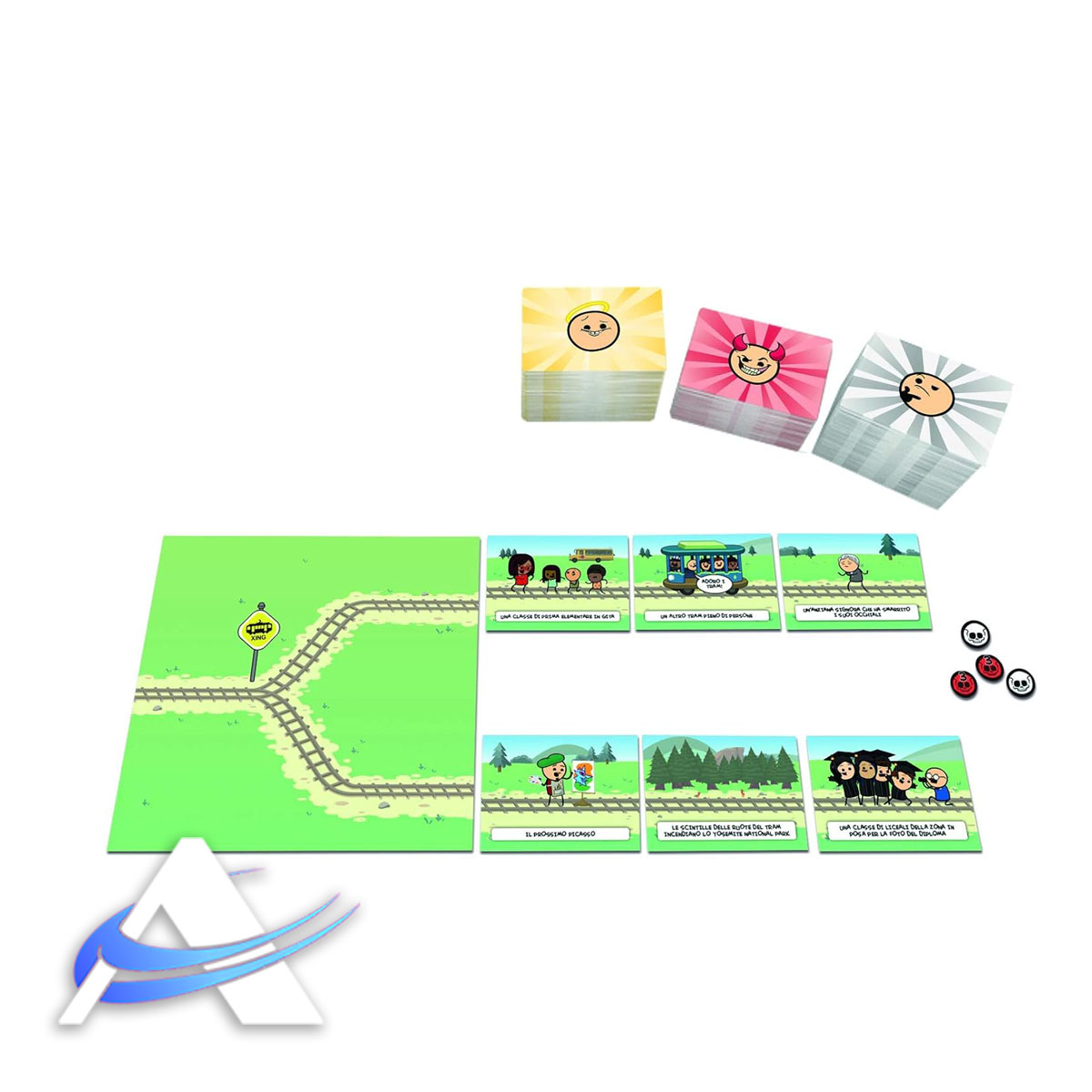 Un giocatore è il Conducente e deve scegliere, tra due binari, su quale mandare un tram fuori controllo, investendo tutti sul suo cammino. Due squadre cercheranno di convincere il Conducente a risparmiare chiunque si trovi sul proprio binario, uccidendo così tutti quelli sull’altro. Come? Giocheranno carte “Innocente” sul proprio binario e carte “Colpevole” sul binario avversario, nonché modificatori per fornire ulteriori valide “informazioni” al conducente in modo da condizionare la sua scelta.