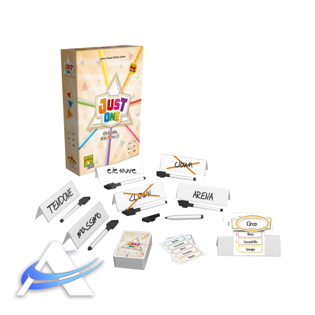 Gioca con i tuoi amici per scoprire più parole Mistero possibili! Just One è un party game cooperativo. Insieme agli altri, fai indovinare una parola Mistero a uno dei giocatori scrivendo segretamente un indizio sul tuo cavalletto. Scegli il tuo indizio senza metterti d'accordo con gli altri e dai prova di originalità cercando di non scrivere lo stesso indizio di un altro giocatore. Tutti gli indizi identici, infatti, vengono annullati ancora prima che il giocatore attivo possa vederli. Alla fine della partita, calcola il punteggio in base al numero di parole Mistero indovinate.