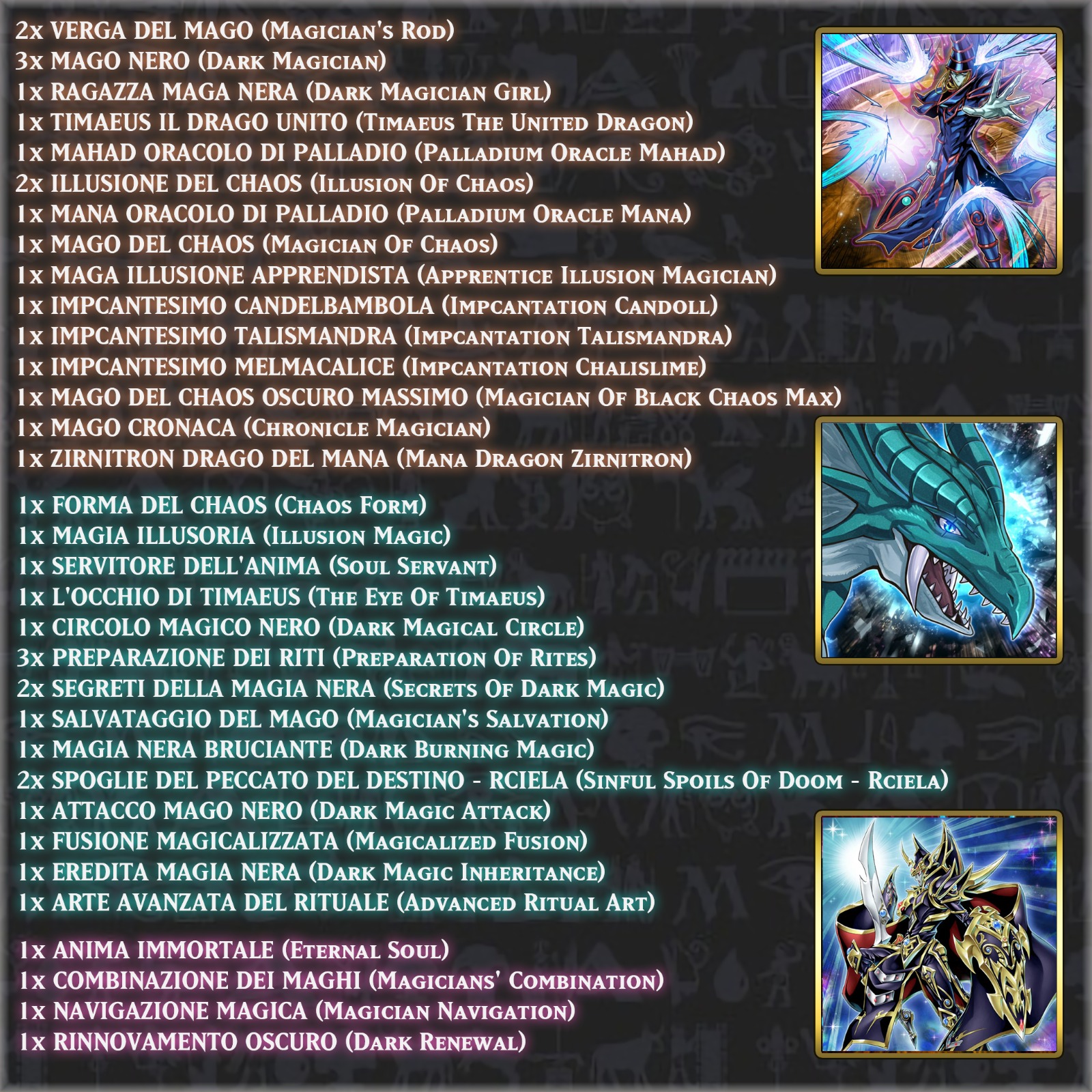 Le carte di questo mazzo possono essere in Qualsiasi Rarità o Lingua (Italiana o Inglese), sempre e comunque rispettando la lista delle carte.