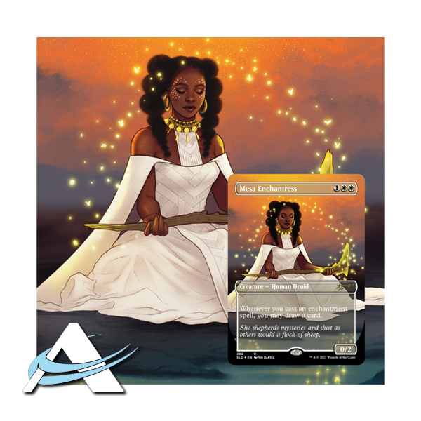 Jen Bartel è qui e fa sul serio. Ha affinato le sue abilità sul campo lavorando per varie delle più importanti case editrici di fumetti e ora è il turno di Magic. Quando ha spalancato le porte di Wizards HQ con due calci di karate, è subito andata alla carica verso la zona degli illustratori. Ma solo dopo aver effettuato sei diverse prese di judo sui perplessi membri dello staff ci ha rivelato cosa voleva: il suo drop di Secret Lair personale. Abbiamo accettato seduta stante, in parte per paura, ma soprattutto per rispetto del suo talento assurdo. Jen e il suo talento si sono messi subito al lavoro. Alcune settimane dopo, una freccia infuocata ha fatto breccia attraverso la finestra dell’ufficio del nostro capo, incenerendo una felce accuratamente potata. Attaccate alla freccia abbiamo trovato le illustrazioni delle seguenti carte.