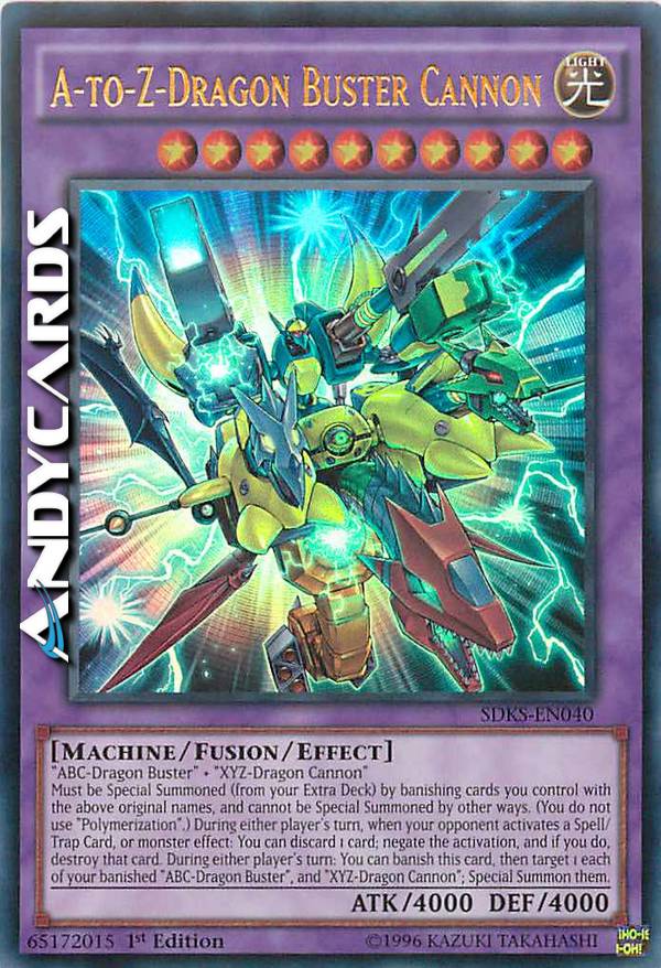 "ABC-Dragon Buster" + "XYZ-Dragon Cannon" - Must be Special Summoned (from your Extra Deck) by banishing cards you control with the above original names, and cannot be Special Summoned by other ways. (You do not use "Polymerization".) During either player's turn, when your opponent activates a Spell/Trap Card, or monster effect: You can discard 1 card; negate the activation, and if you do, destroy that card. During either player's turn: You can banish this card, then target 1 each of your banished "ABC-Dragon Buster" and "XYZ-Dragon Cannon"; Special Summon them.