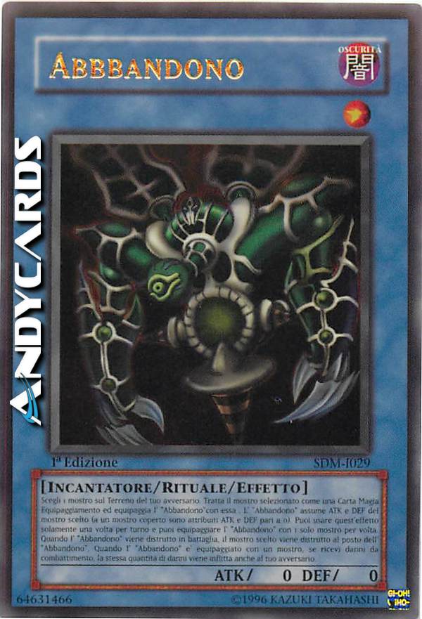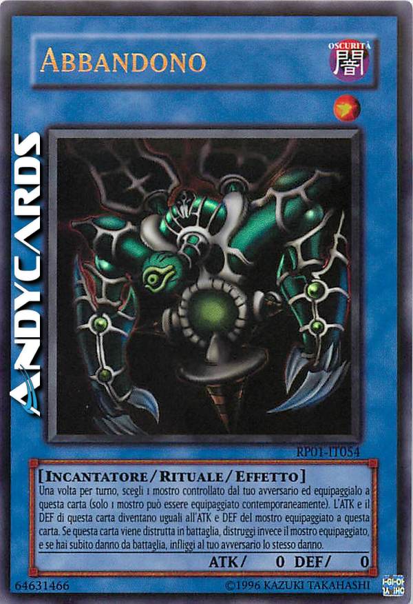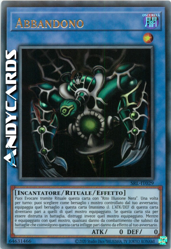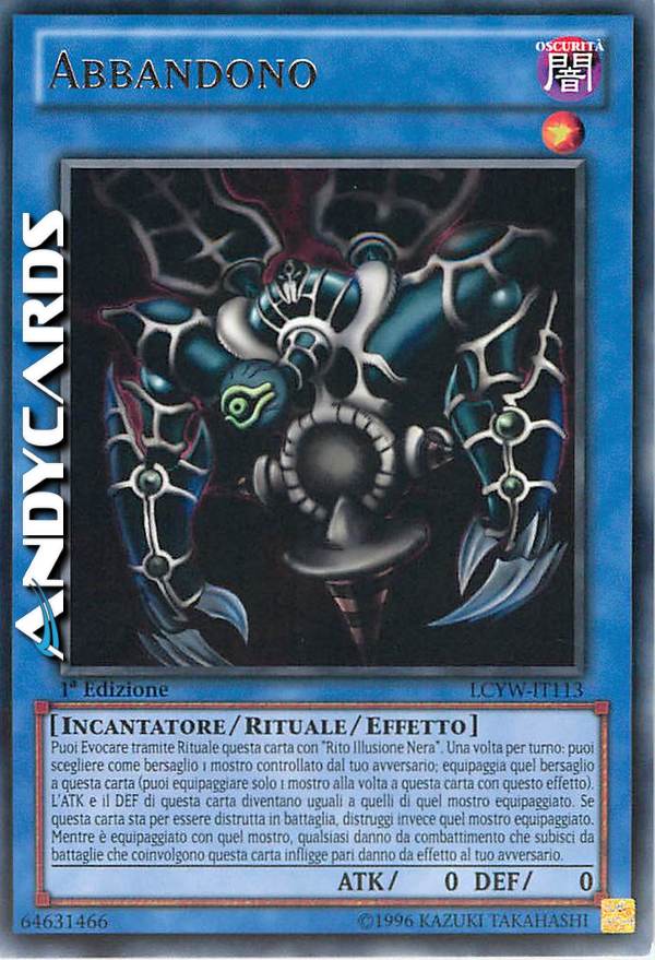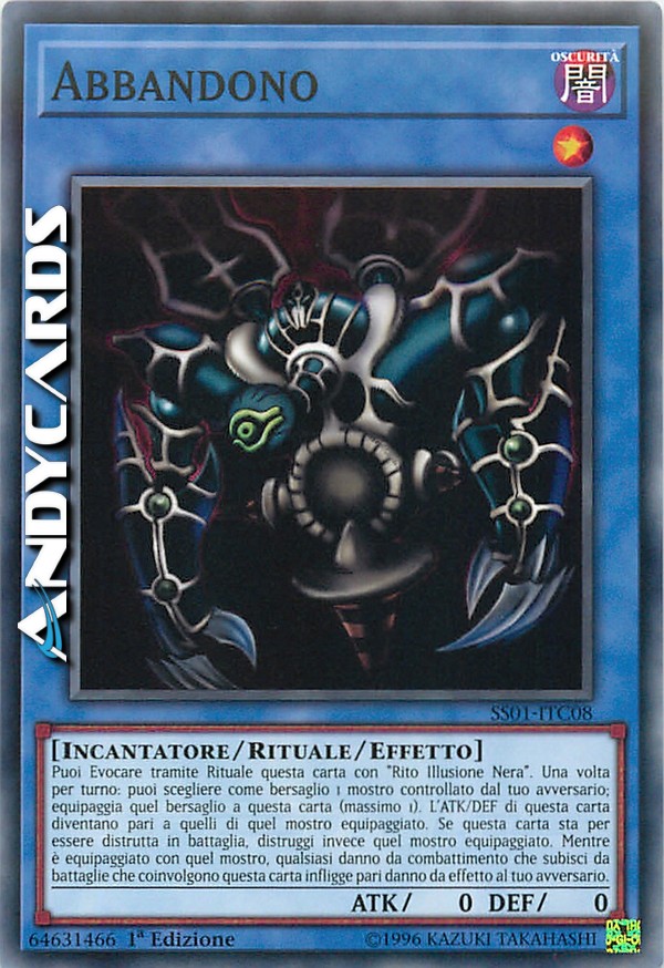 Puoi Evocare tramite Rituale questa carta con "Rito Illusione Nera". Una volta per turno: puoi scegliere come bersaglio 1 mostro controllato dal tuo avversario; equipaggia quel bersaglio a questa carta (massimo 1). L'ATK/DEF di questa carta diventano pari a quelli di quel mostro equipaggiato. Se questa carta sta per essere distrutta in battaglia, distruggi invece quel mostro equipaggiato. Mentre è equipaggiato con quel mostro, qualsiasi danno da combattimento che subisci da battaglie che coinvolgono questa carta infligge pari danno da effetto al tuo avversario.