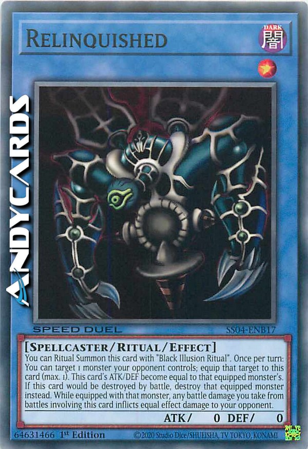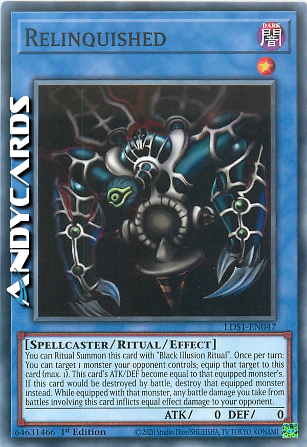 You can Ritual Summon this card with "Black Illusion Ritual". Once per turn: You can target 1 monster your opponent controls; equip that target to this card (max. 1). This card's ATK/DEF become equal to that equipped monster's. If this card would be destroyed by battle, destroy that equipped monster instead. While equipped with that monster, any battle damage you take from battles involving this card inflicts equal effect damage to your opponent.