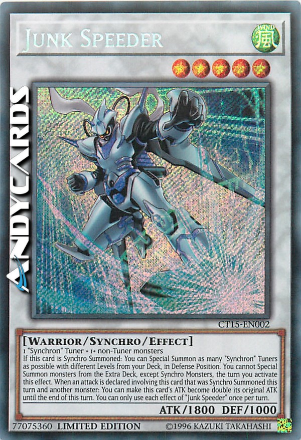If this card is Synchro Summoned: You can Special Summon as many "Synchron" Tuners as possible with different Levels from your Deck, in Defense Position. You cannot Special Summon monsters from the Extra Deck, except Synchro Monsters, the turn you activate this effect. When an attack is declared involving this card that was Synchro Summoned this turn and another monster: You can make this card's ATK become double its original ATK until the end of this turn. You can only use each effect of "Junk Speeder" once per turn.