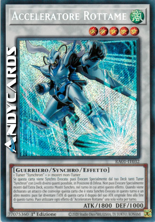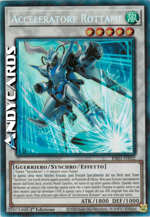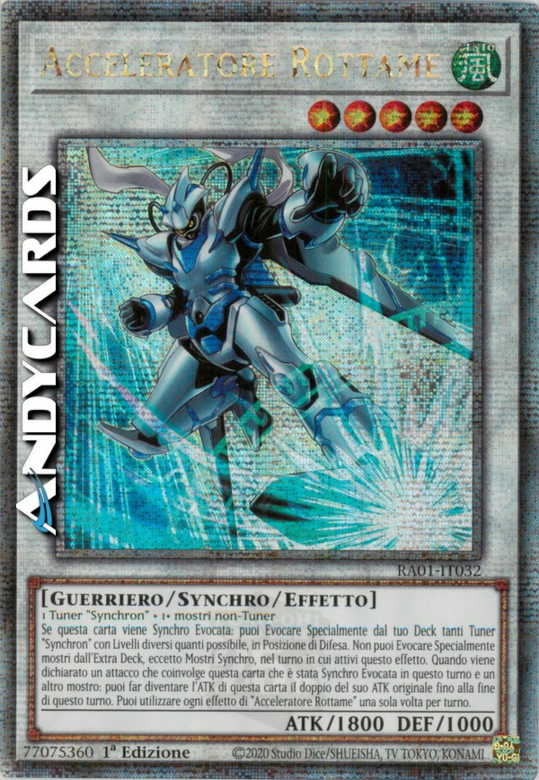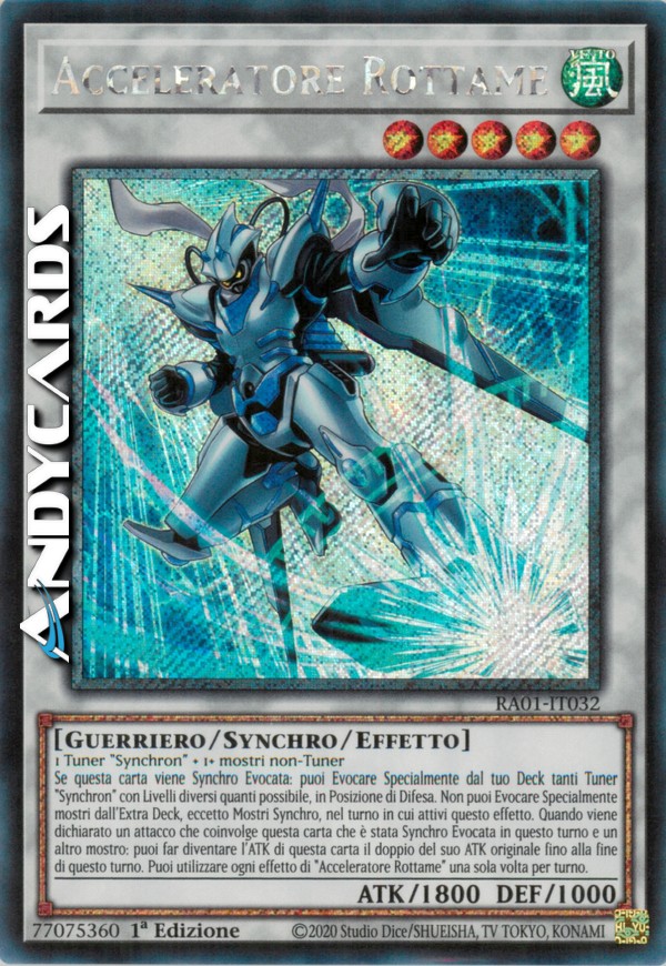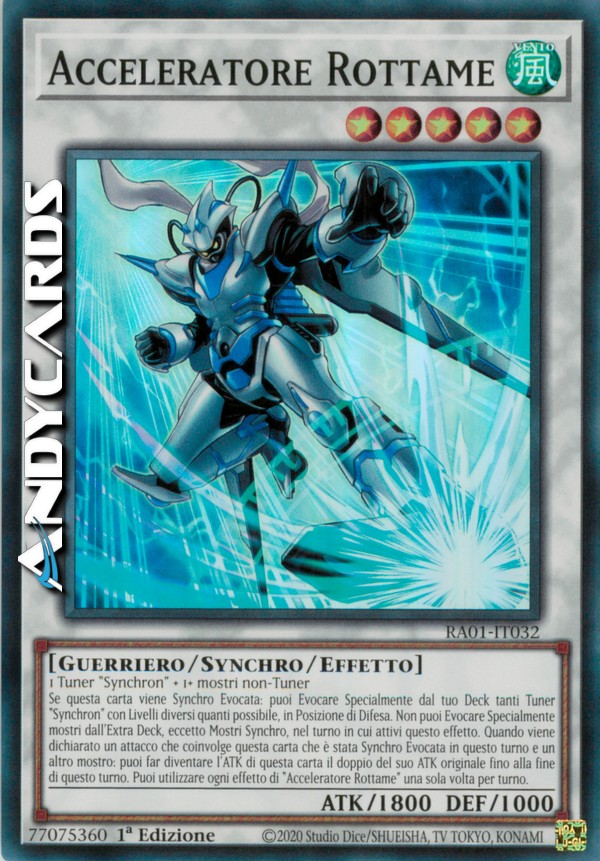 Se questa carta viene Synchro Evocata: puoi Evocare Specialmente dal tuo Deck tanti Tuner "Synchron" con Livelli diversi quanti possibile, in Posizione di Difesa. Non puoi Evocare Specialmente mostri dall'Extra Deck, eccetto Mostri Synchro, nel turno in cui attivi questo effetto. Quando viene dichiarato un attacco che coinvolge questa carta che è stata Synchro Evocata in questo turno e un altro mostro: puoi far diventare l'ATK di questa carta il doppio del suo ATK originale fino alla fine di questo turno. Puoi utilizzare ogni effetto di "Acceleratore Rottame" una sola volta per turno.