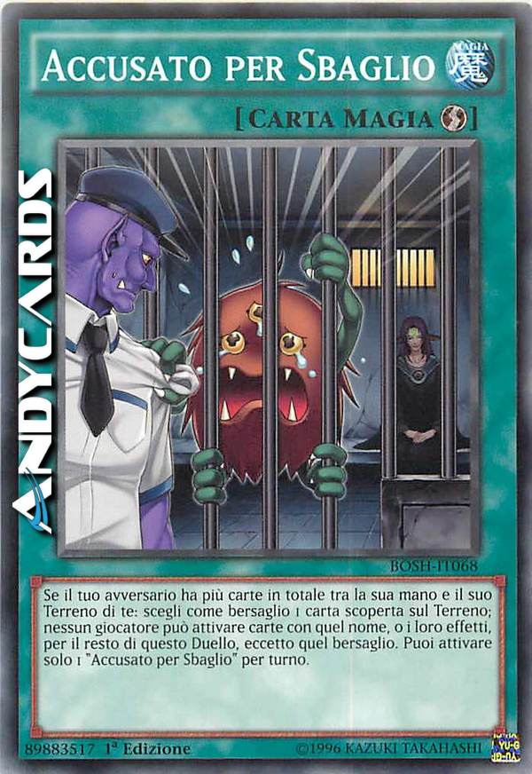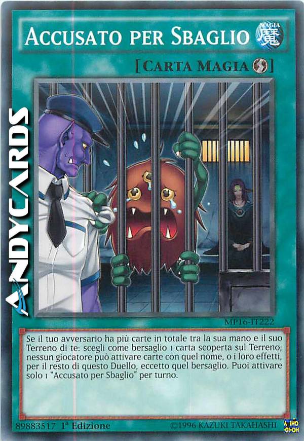 Se il tuo avversario ha più carte in totale tra la sua mano e il suo Terreno di te: scegli come bersaglio 1 carta scoperta sul Terreno; nessun giocatore può attivare carte con quel nome, o i loro effetti, per il resto di questo Duello, eccetto quel bersaglio. Puoi attivare solo 1 "Accusato per Sbaglio" per turno.