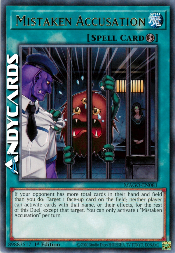 If your opponent has more total cards in their hand and their side of the field than you do: Target 1 face-up card on the field; neither player can activate cards with that name, or their effects, for the rest of this Duel, except that target. You can only activate 1 "Mistaken Accusation" per turn.