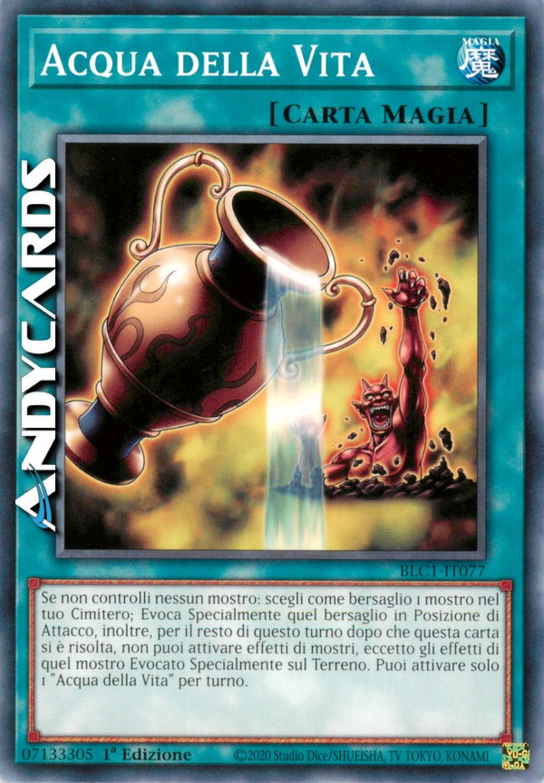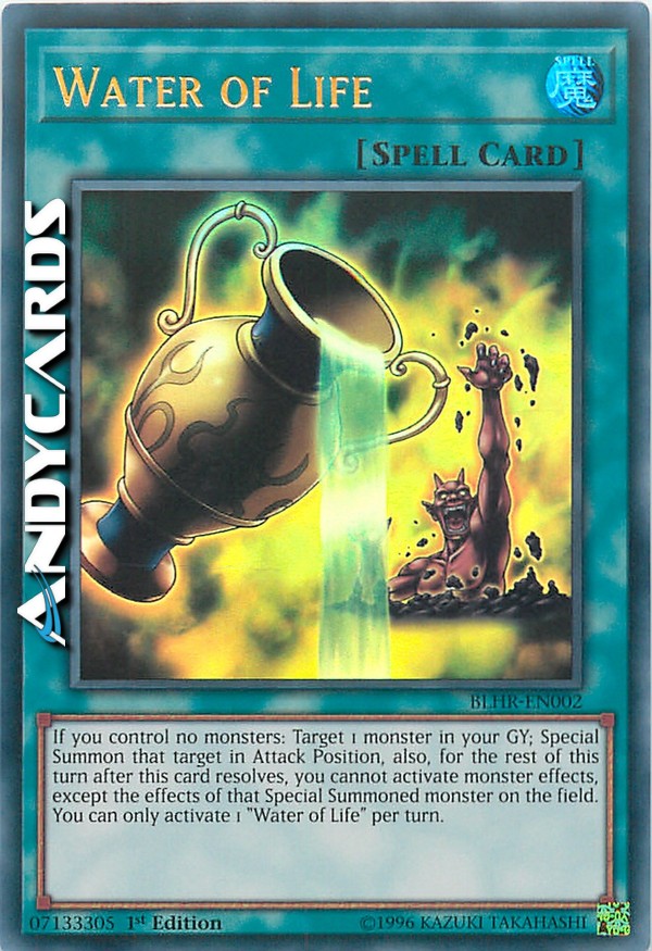 Se non controlli nessun mostro: scegli come bersaglio 1 mostro nel tuo Cimitero; Evoca Specialmente quel bersaglio in Posizione di Attacco, inoltre, per il resto di questo turno dopo che questa carta si è risolta, non puoi attivare effetti di mostri, eccetto gli effetti di quel mostro Evocato Specialmente sul Terreno. Puoi attivare solo 1 "Acqua della Vita" per turno.