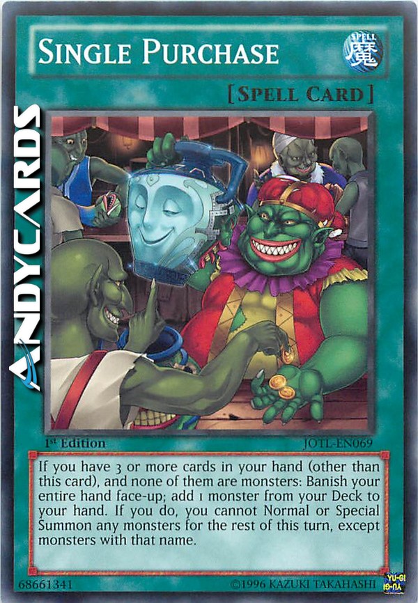 Se hai 3 o meno carte nella tua mano (oltre a questa carta) e nessuna di esse è un mostro: bandisci tutta la tua mano scoperta; aggiungi 1 mostro dal tuo Deck alla tua mano. Se lo fai, non puoi Evocare Normalmente o Specialmente nessun mostro per il resto di questo turno, eccetto mostro con quel nome.
