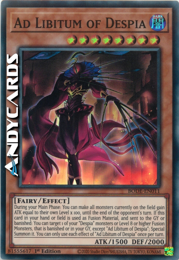 During your Main Phase: You can make all monsters currently on the field gain ATK equal to their own Level x 100, until the end of the opponent's turn. If this card in your hand or field is used as Fusion Material, and sent to the GY or banished: You can target 1 of your "Despia" monsters or Level 8 or higher Fusion Monsters, that is banished or in your GY, except "Ad Libitum of Despia"; Special Summon it. You can only use each effect of "Ad Libitum of Despia" once per turn.