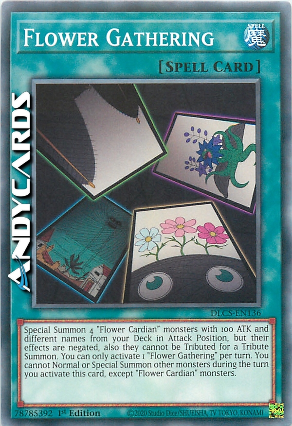 Evoca Specialmente 4 mostri "Fiore Cardian" con ATK 100 e nomi diversi dal tuo Deck in Posizione di Attacco, ma i loro effetti si annullano, inoltre non possono essere offerti come Tributo per un'Evocazione tramite Tributo. Puoi attivare solo 1 "Adunata dei Fiori" per turno. Non puoi Evocare Normalmente o Specialmente altri mostri durante il turno in cui attivi questa carta, eccetto mostri "Fiore Cardian".