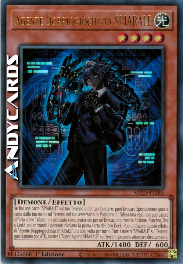 Se hai una carta "SPIARALE" sul tuo Terreno o nel tuo Cimitero: puoi Evocare Specialmente questa carta dalla tua mano sul Terreno del tuo avversario in Posizione di Difesa (ma essa non può essere offerta come Tributo, né utilizzata come materiale per un'Evocazione tramite Fusione, Synchro, Xyz o Link), poi entrambi i giocatori rivelano la prima carta del loro Deck. Puoi utilizzare questo effetto di "Agente Doppiogiochista SPIARALE" una sola volta per turno. Tutti i mostri "SPIARALE" sul Terreno guadagnano 500 ATK, inoltre i "Super Agente SPIARALE" sul Terreno possono attaccare direttamente.