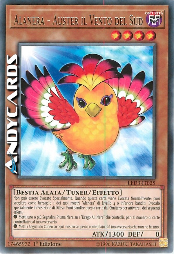Non può essere Evocato Specialmente. Quando questa carta viene Evocata Normalmente: puoi scegliere come bersaglio 1 dei tuoi mostri "Alanera" di Livello 4 o inferiore banditi; Evocalo Specialmente in Posizione di Difesa. Puoi bandire questa carta dal Cimitero per attivare 1 dei seguenti effetti;