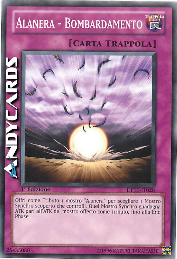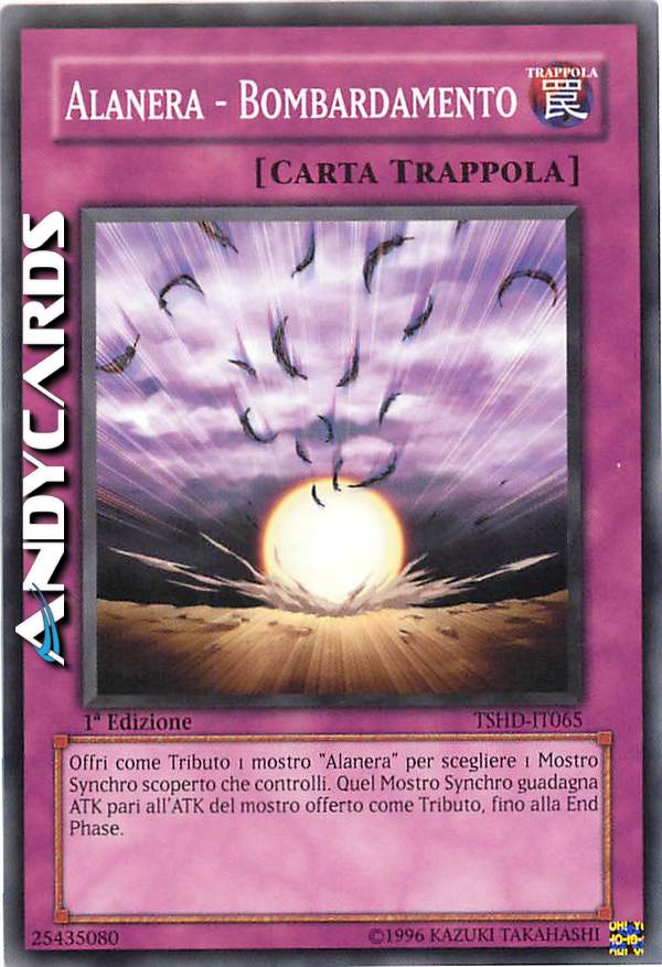 Offri come Tributo 1 mostro "Alanera" per scegliere 1 Mostro Synchro scoperto che controlli. Quel Mostro Synchro guadagna ATK pari all'ATK del mostro offerto come Tributo, fino alla End Phase.