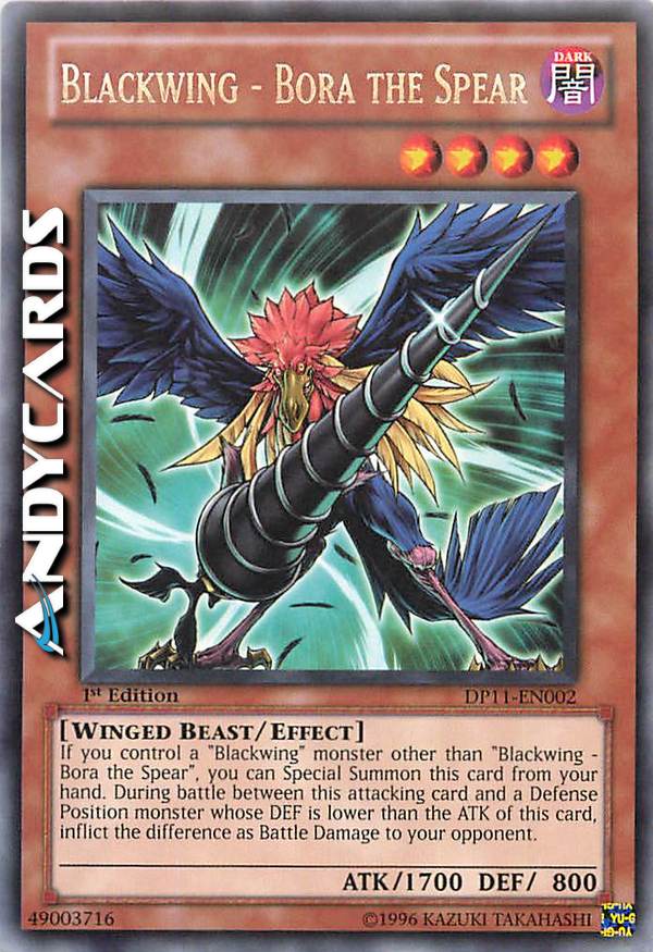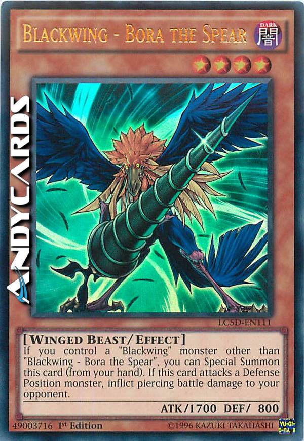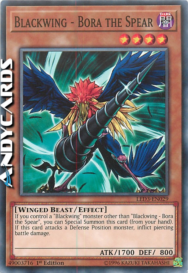 If you control a "Blackwing" monster other than "Blackwing - Bora the Spear", you can Special Summon this card (from your hand). If this card attacks a Defense Position monster, inflict piercing battle damage.