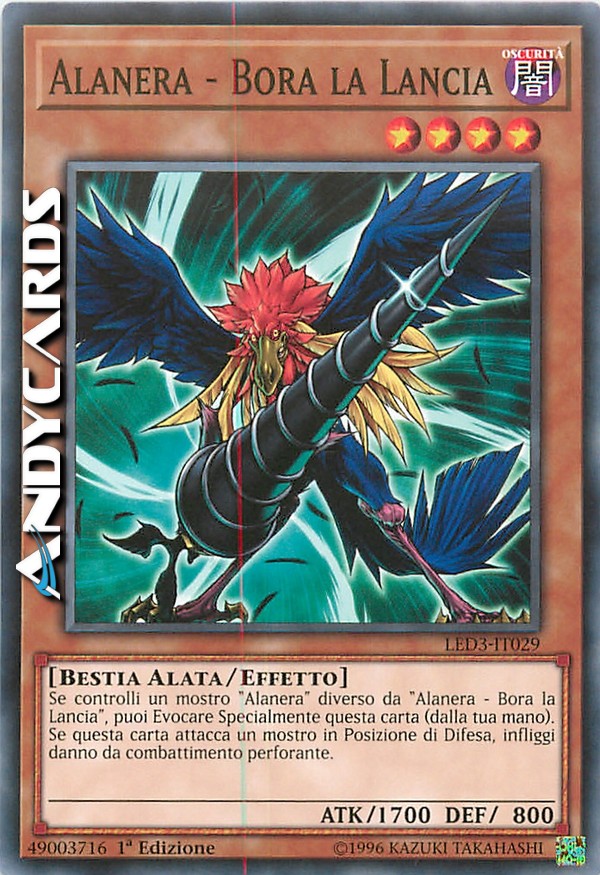 Se controlli un mostro "Alanera" diverso da "Alanera - Bora la Lancia", puoi Evocare Specialmente questa carta (dalla tua mano). Se questa carta attacca un mostro in Posizione di Difesa, infliggi danno da combattimento perforante.