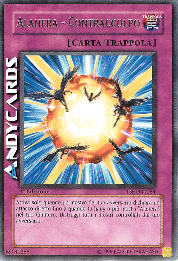 Quando un mostro dell'avversario dichiara un attacco diretto mentre tu hai 5 o più mostri "Alanera" nel tuo Cimitero: distruggi tutti i mostri controllati dal tuo avversario.