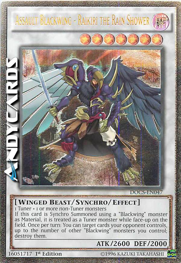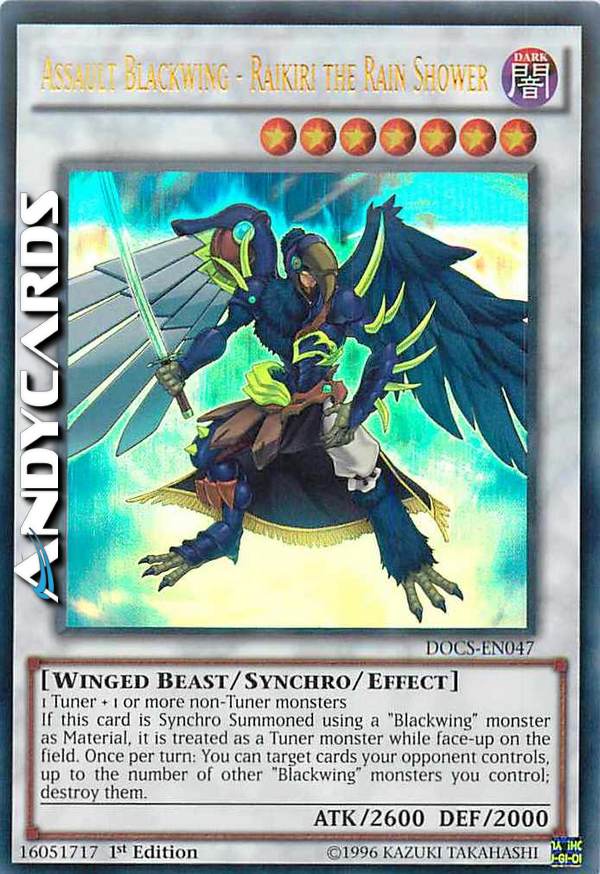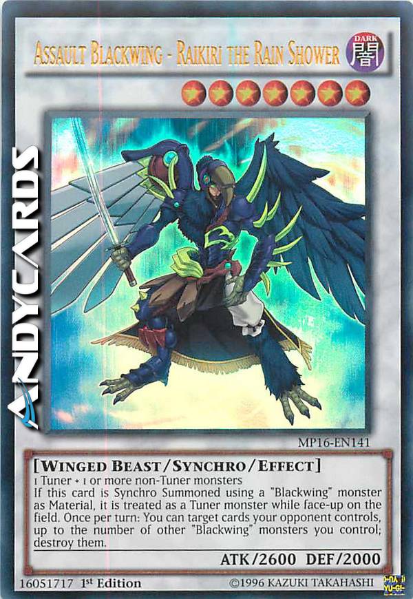 1 Tuner + 1 or more non-Tuner monsters - If this card is Synchro Summoned using a "Blackwing" monster as Material, it is treated as a Tuner monster while face-up on the field. Once per turn: You can target cards your opponent controls, up to the number of other "Blackwing" monsters you control; destroy them.