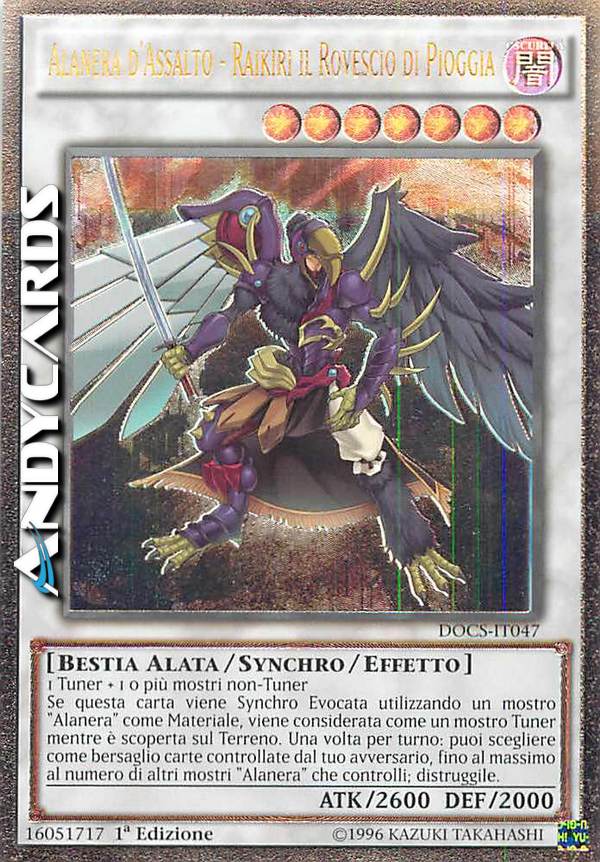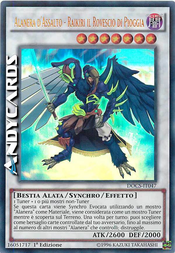Se questa carta viene Synchro Evocata utilizzando un mostro "Alanera" come Materiale, viene considerata come un mostro Tuner mentre è scoperta sul Terreno. Una volta per turno: puoi scegliere come bersaglio carte controllate dal tuo avversario, fino al massimo al numero di altri mostri "Alanera" che controlli; distruggile.