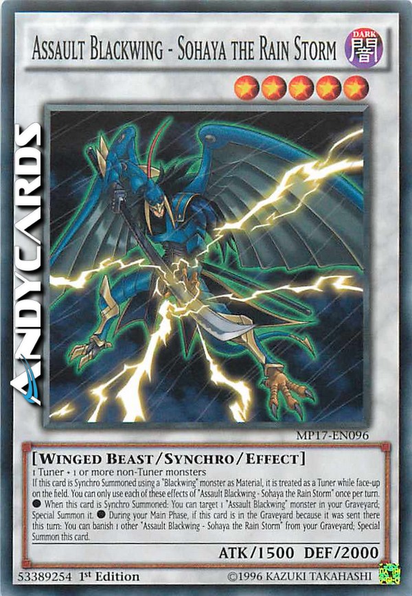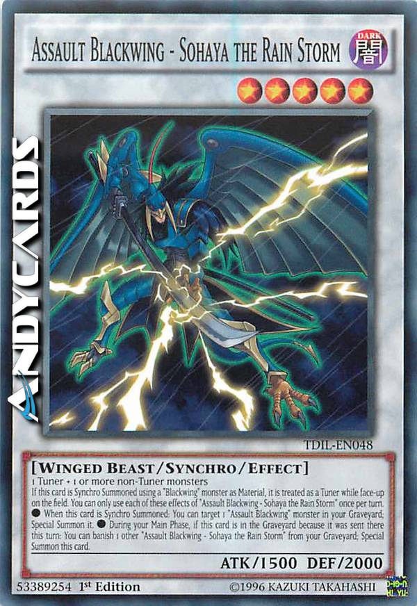 If this card is Synchro Summoned using a "Blackwing" monster as material, it is treated as a Tuner while face-up on the field. You can only use each of these effects of "Assault Blackwing - Sohaya the Rain Storm" once per turn.