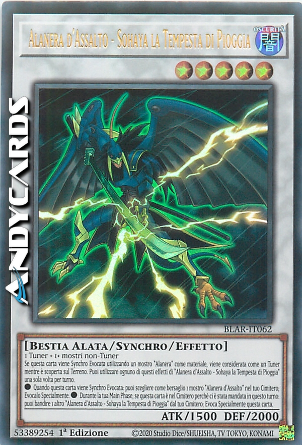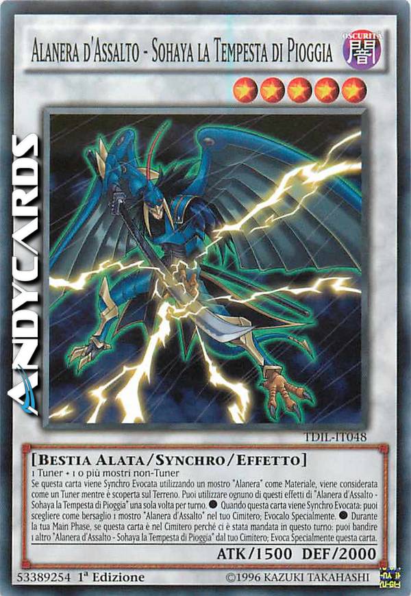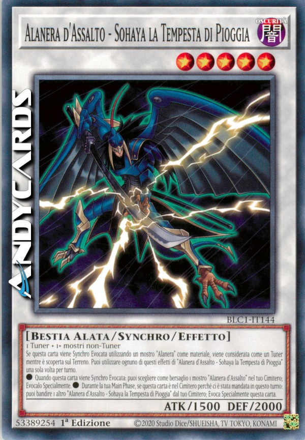 Se questa carta viene Synchro Evocata utilizzando un mostro "Alanera" come materiale, viene considerata come un Tuner mentre è scoperta sul Terreno. Puoi utilizzare ognuno di questi effetti di "Alanera d'Assalto - Sohaya la Tempesta di Pioggia" una sola volta per turno.